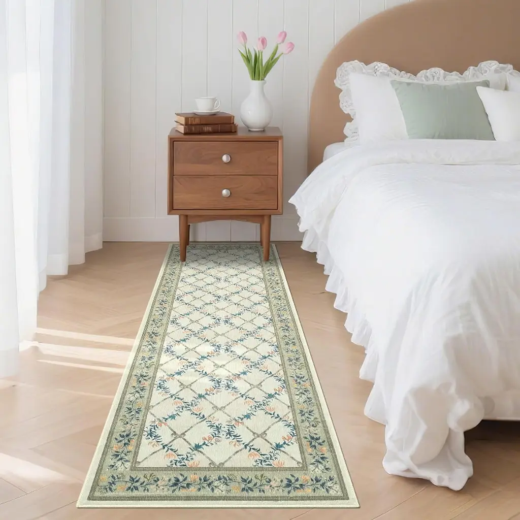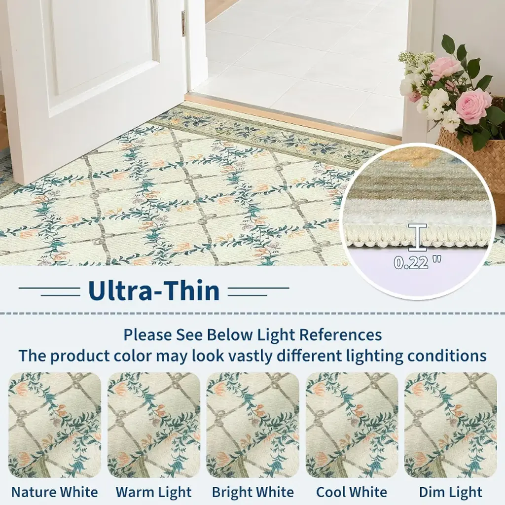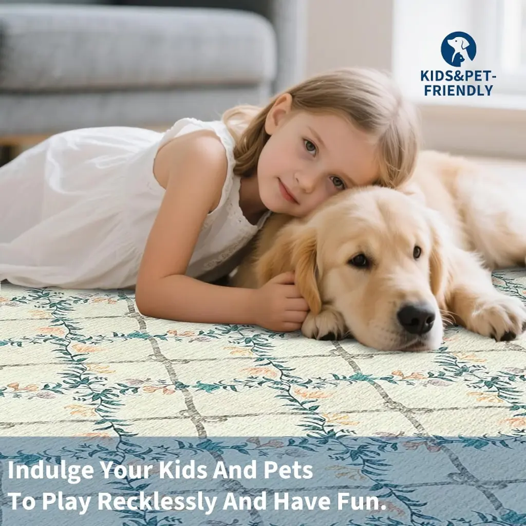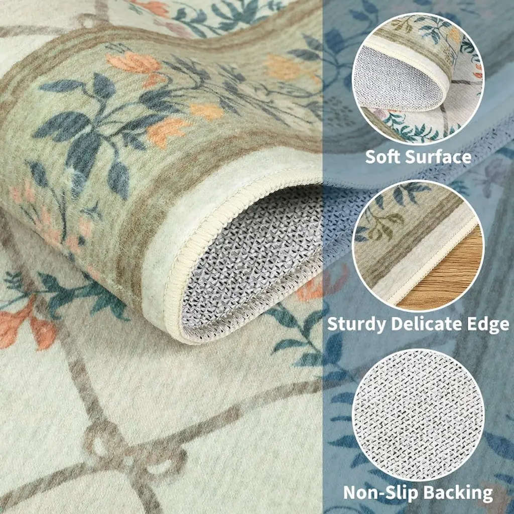 This machine-washable rug is crafted from durable, high-quality faux wool with a low-pile, stain-resistant design that withstands high traffic and is easy to clean, making it ideal for homes with kids and pets. It features a non-slip TPR backing for safety, a charming floral pattern for elegant home decor, and simple care instructions to quickly smooth out any initial creases upon arrival.
