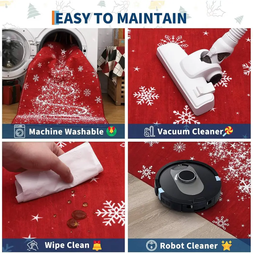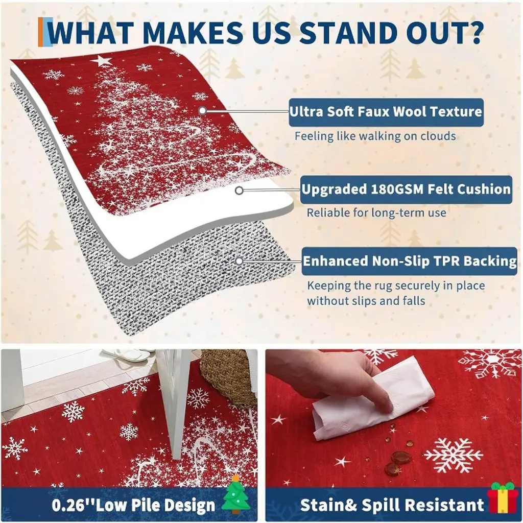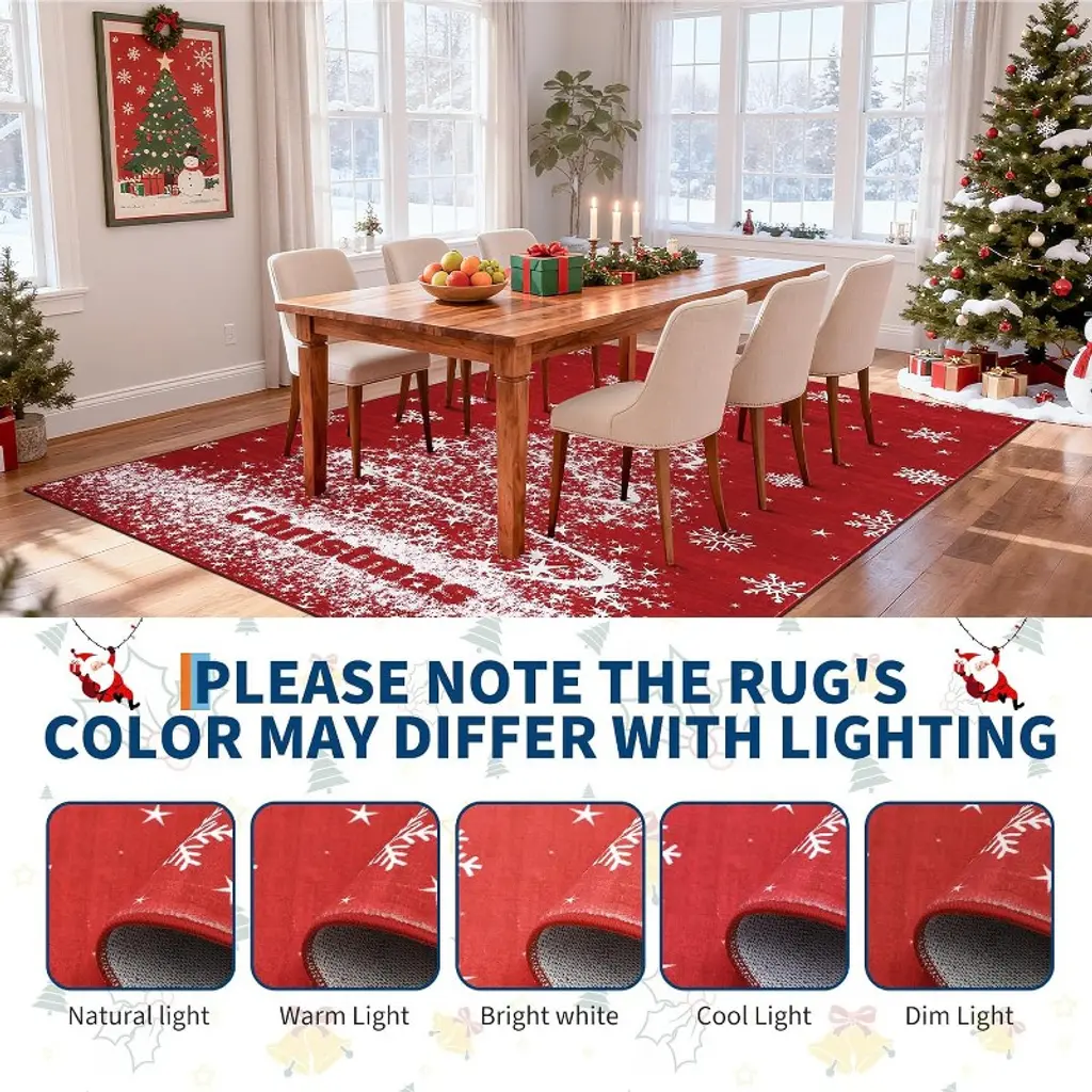 Elevate your holiday decor with this exclusively designed Christmas rug, featuring classic festive patterns. Crafted from soft, low-pile polyester, it's both durable and easy to clean by vacuum or machine wash. The built-in TPR non-slip backing ensures safety for kids and pets, with no extra pad needed. Versatile for any room, this rug is a practical and stylish gift that effortlessly enhances your festive atmosphere.