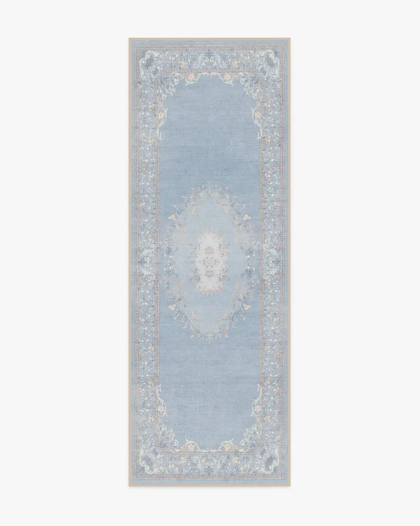 Inspired by handpainted Chinese artistry, Gracie Hampton Soft Blue Rug features richly-colored birds and butterflies, framed by subtle patterns. A soft palette of graphite-colored florals, blue-greens, dusty reds, soft oranges, and yellows pops beautifully against a soft robin's egg blue background. Water-resistant, stain-resistant, and machine-washable. Rug colors may vary slightly according to your device and the lighting in your space.