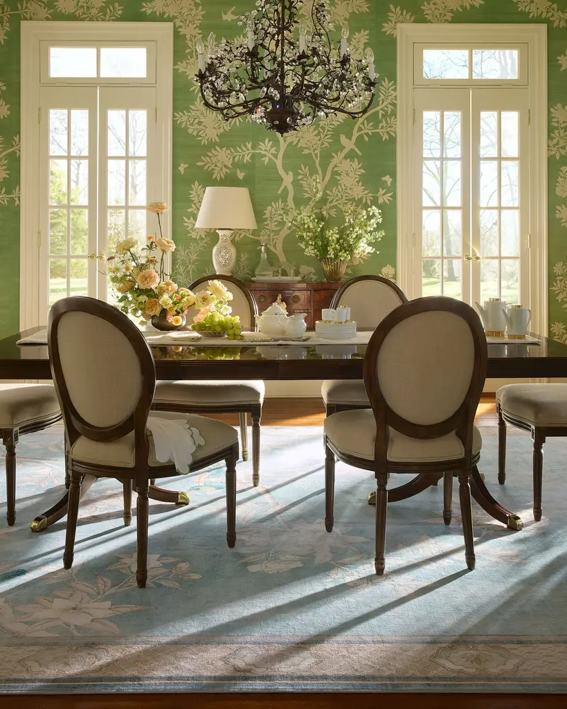 Inspired by handpainted Chinese artistry, Gracie Hampton Soft Blue Rug features richly-colored birds and butterflies, framed by subtle patterns. A soft palette of graphite-colored florals, blue-greens, dusty reds, soft oranges, and yellows pops beautifully against a soft robin's egg blue background. Water-resistant, stain-resistant, and machine-washable. Rug colors may vary slightly according to your device and the lighting in your space.