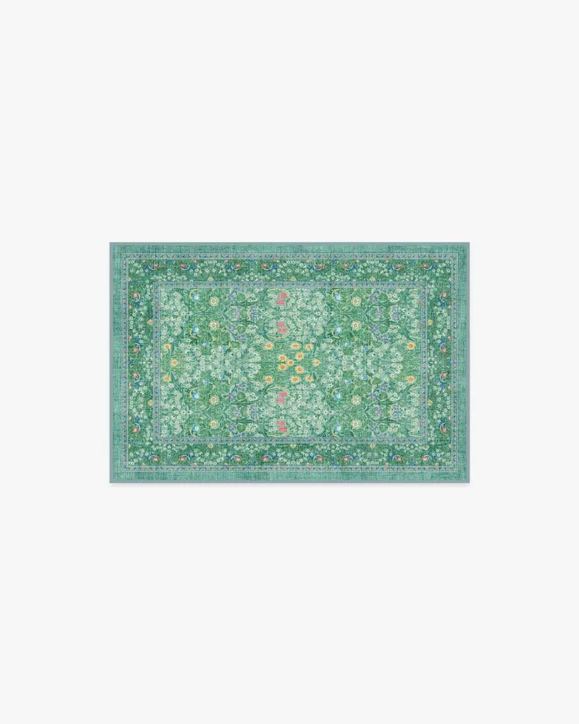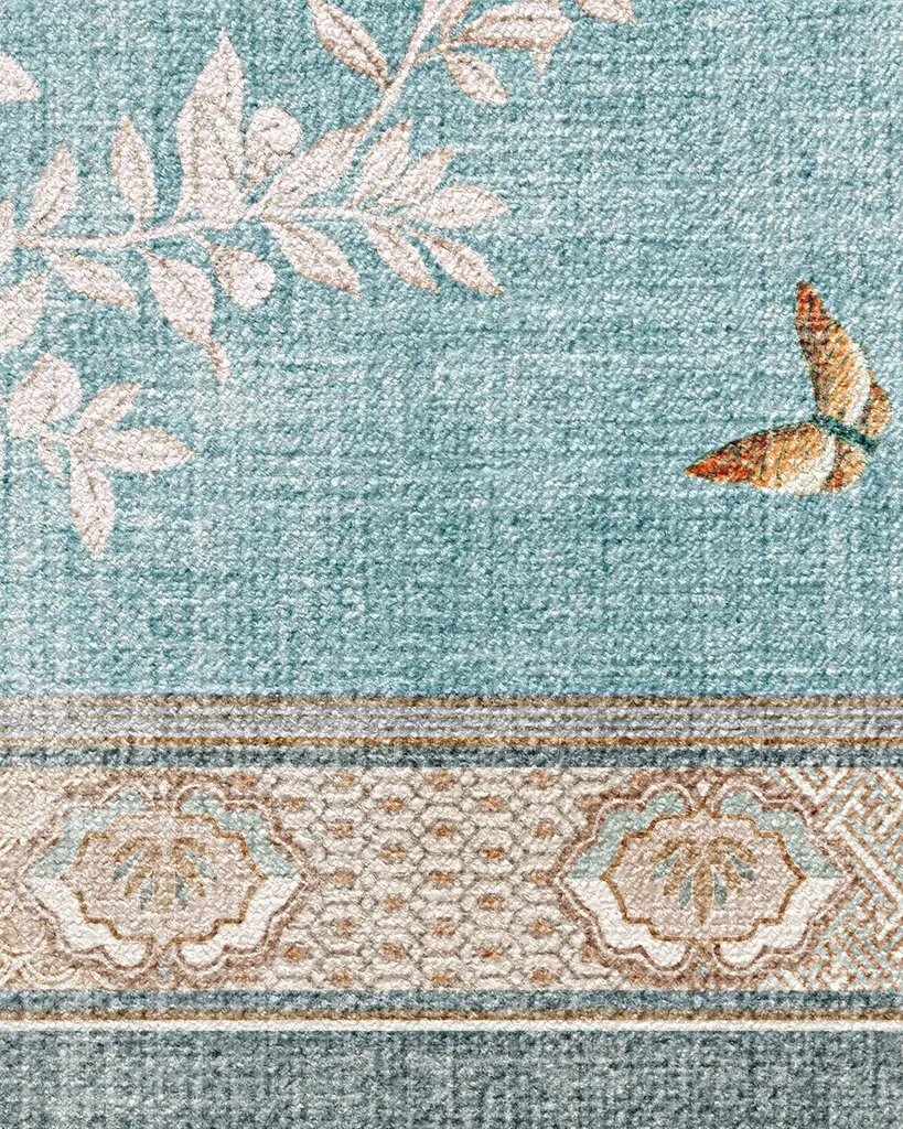 Inspired by handpainted Chinese artistry, Gracie Hampton Soft Blue Rug features richly-colored birds and butterflies, framed by subtle patterns. A soft palette of graphite-colored florals, blue-greens, dusty reds, soft oranges, and yellows pops beautifully against a soft robin's egg blue background. Water-resistant, stain-resistant, and machine-washable. Rug colors may vary slightly according to your device and the lighting in your space.