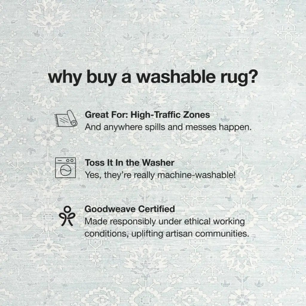 Our soft, low-pile Hana washable area rug features a faded floral pattern in a dreamy mix of sky blue and ivory. Distressed detailing gives it a well-loved feel that has the look of a vintage find. We love how easy this stain-resistant rug cleans upjust toss it in the wash for a refresh. Plus, the non-slip backing makes it a perfect choice for playrooms, nurseries and other kid spaces where a beautiful design matters as much as real-life durability.Try it on first. Because color representation may vary by screen, using a swatch is an easy way to see exactly how your favorite rugs will look in your home. Our rug swatches ship free and can be returned at any store for a full refund.Order rugs up to 6'x9' online and pick up in a store near you. It's fast, easy and free.For 8'x10' and larger rugs, order online and arrange a convenient warehouse pickup or delivery.
