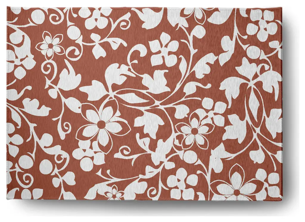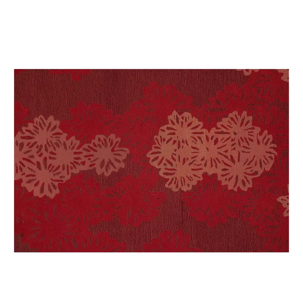 A dynamic and graceful addition to modern interiors, the rug is defined by an ensemble of burgundy, carmine, and brick red shades. It is meticulously hand-tufted from precious wool and decorated with a delightful motif of chrysanthemum flowers.