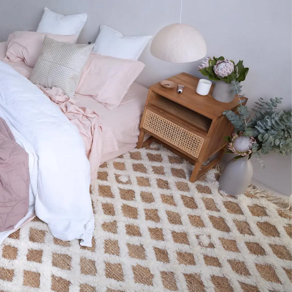 The Diamonds Weave mixes the durability and natural beauty of hemp with the softness of the wool. The Diamonds Weave is formed on a base of plaited renewable raw hemp, with a classic diamond and dot pattern skilfully hand-knotted into place to create texture through this rich piece. The Diamonds Weave has an earthy elevated edge, created with an abundance of natural elements, perfect for resort and tranquil living.All ground control rugs are hand-loomed to order. Please allow 6 weeks for delivery. Composition : Hemp 70% – Wool 30%.