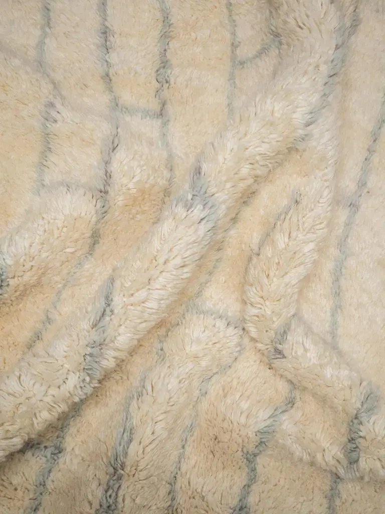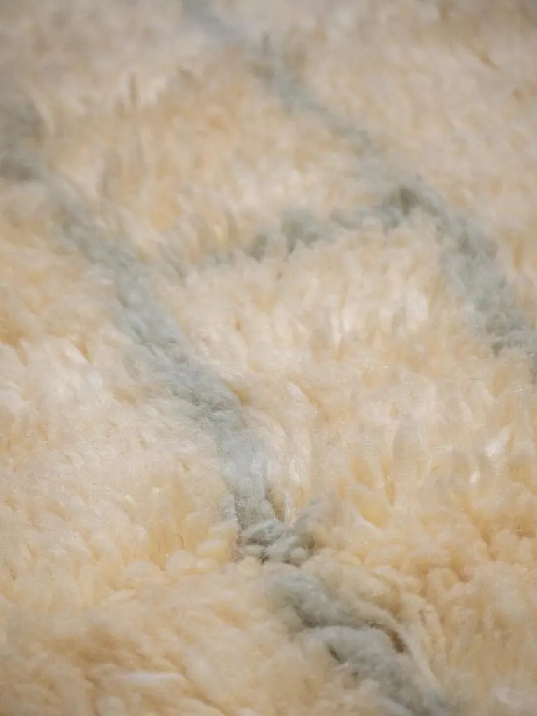 We exclusively create custom individual rugs for you. This means that we do not produce unnecessary items and we prioritize respecting nature. That's why we estimate it will take us around 7-8 weeks to create your rug.Beni Mrirt rugs are made of 100% soft and tender highest quality sheep wool, which is carefully gathered and taken care of. The Beni Mrirt rugs are considered to be the diamond of the Moroccan carpets collections well-deserved due to their superior quality. At first glance, Beni Mrirt and Beni Ourain look similar, but there is still a significant difference between them. The Beni Mrirt rug knot-tying technique varies by its fine weaving which is done more tightly. Ornaments and color palettes are different too. Except for widely used geometrical prints, carpets can be decorated with abstract compositions and the traditional Berber symbols of different colors: from black and brown to indigo and ochre.