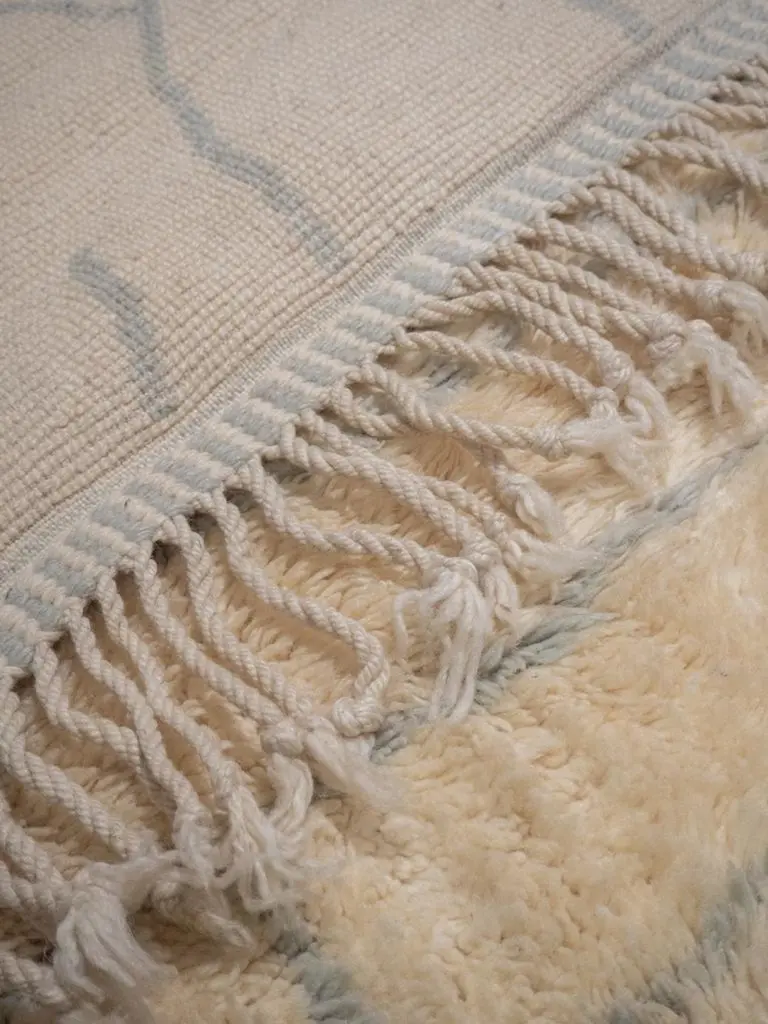 We exclusively create custom individual rugs for you. This means that we do not produce unnecessary items and we prioritize respecting nature. That's why we estimate it will take us around 7-8 weeks to create your rug.Beni Mrirt rugs are made of 100% soft and tender highest quality sheep wool, which is carefully gathered and taken care of. The Beni Mrirt rugs are considered to be the diamond of the Moroccan carpets collections well-deserved due to their superior quality. At first glance, Beni Mrirt and Beni Ourain look similar, but there is still a significant difference between them. The Beni Mrirt rug knot-tying technique varies by its fine weaving which is done more tightly. Ornaments and color palettes are different too. Except for widely used geometrical prints, carpets can be decorated with abstract compositions and the traditional Berber symbols of different colors: from black and brown to indigo and ochre.