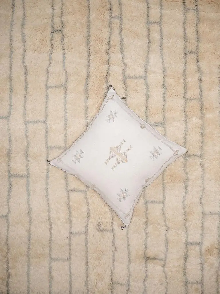 We exclusively create custom individual rugs for you. This means that we do not produce unnecessary items and we prioritize respecting nature. That's why we estimate it will take us around 7-8 weeks to create your rug.Beni Mrirt rugs are made of 100% soft and tender highest quality sheep wool, which is carefully gathered and taken care of. The Beni Mrirt rugs are considered to be the diamond of the Moroccan carpets collections well-deserved due to their superior quality. At first glance, Beni Mrirt and Beni Ourain look similar, but there is still a significant difference between them. The Beni Mrirt rug knot-tying technique varies by its fine weaving which is done more tightly. Ornaments and color palettes are different too. Except for widely used geometrical prints, carpets can be decorated with abstract compositions and the traditional Berber symbols of different colors: from black and brown to indigo and ochre.
