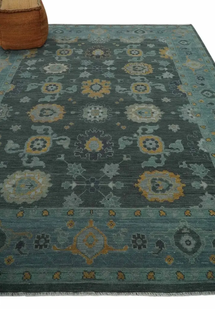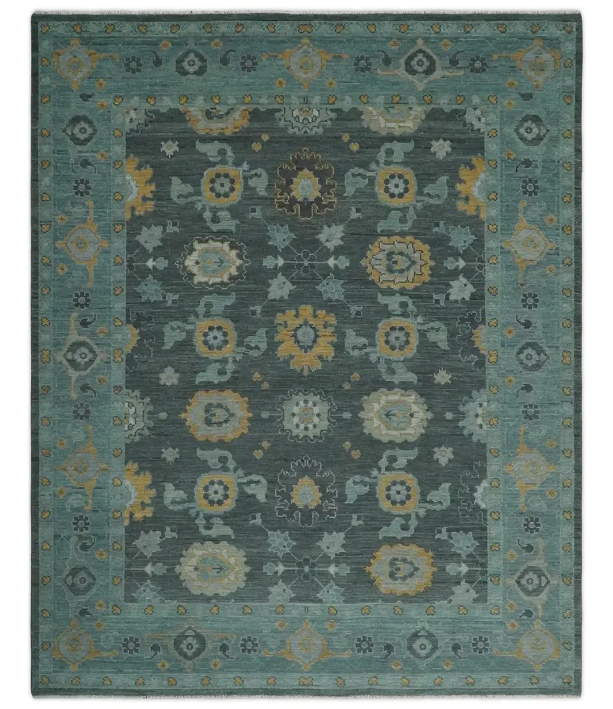 This hand-knotted Oushak Wool Area Rug is crafted with traditional styling in a charcoal and aqua colorway. Its multi-size design makes it perfect for use in multiple rooms, complementing any décor. Its wool construction ensures long-lasting quality. Hand-Knotted SIZES ARE MADE TO ORDER IN 30-45 DAYS Made with Wool Color : Charcoal and Aqua Made with 28 knots per square inch This specific rug is made in India, in the city of Bhadohi. Bhadohi is one of the biggest rug manufacturing cities. Carpet weaving in the region dates back to the 16th century during the reign of Akbar. The skilled artisans of Bhadohi have been carrying the tradition of rug-making for centuries. USERS GUIDE Avoid prolonged moisture Vacuum regularly and/or shake to remove dust Do not pull any loose threads. Use scissors to simply cut the ends The blot spills immediately with a white cloth. Harsh chemicals may damage or fade the rug Use rug protectors under heavy furniture