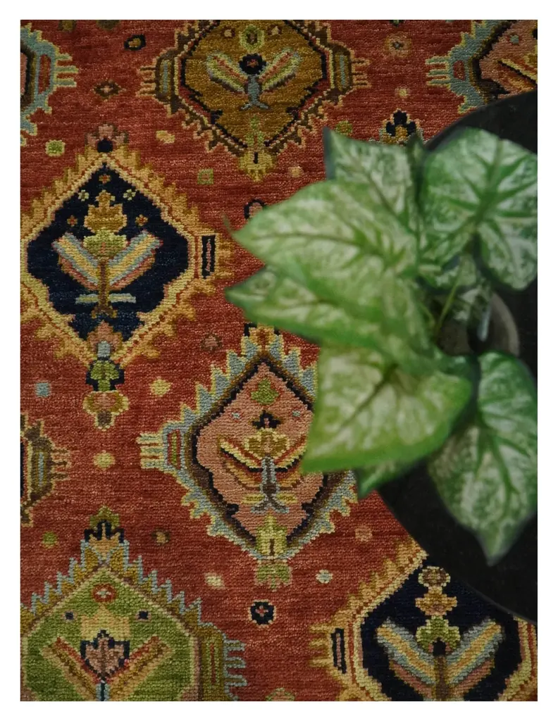 This Hand-Knotted Rug has been Made with Handspun Wool. The beautiful colors of the rug carry a legacy of the heirloom rug. The traditional design of the rug completes your space without making it look busy. Hand-Knotted rugs are durable and can last for decades if treated right. Hand-Knotted Wool Rug MADE TO ORDER IN 30-45 DAYS Color: Rust, Black, and Brown Sizes are made to order 30-45 days This specific rug is made in India, in the city of Bhadohi. Bhadohi is one of the biggest rug manufacturing cities. Carpet weaving in the region dates back to the 16th century during the reign of Akbar. The skilled artisans of Bhadohi have been carrying the tradition of rug-making for centuries. USERS GUIDE Avoid prolonged moisture Vacuum regularly and/or shake to remove dust Do not pull any loose threads. Use scissors to simply cut the ends Blot spills immediately with a white cloth. Harsh chemicals may damage or fade the rug Use rug protectors under heavy furniture