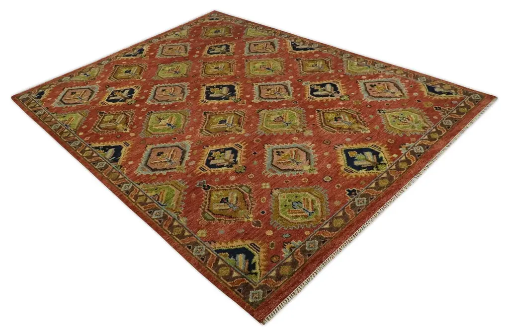 This Hand-Knotted Rug has been Made with Handspun Wool. The beautiful colors of the rug carry a legacy of the heirloom rug. The traditional design of the rug completes your space without making it look busy. Hand-Knotted rugs are durable and can last for decades if treated right. Hand-Knotted Wool Rug MADE TO ORDER IN 30-45 DAYS Color: Rust, Black, and Brown Sizes are made to order 30-45 days This specific rug is made in India, in the city of Bhadohi. Bhadohi is one of the biggest rug manufacturing cities. Carpet weaving in the region dates back to the 16th century during the reign of Akbar. The skilled artisans of Bhadohi have been carrying the tradition of rug-making for centuries. USERS GUIDE Avoid prolonged moisture Vacuum regularly and/or shake to remove dust Do not pull any loose threads. Use scissors to simply cut the ends Blot spills immediately with a white cloth. Harsh chemicals may damage or fade the rug Use rug protectors under heavy furniture