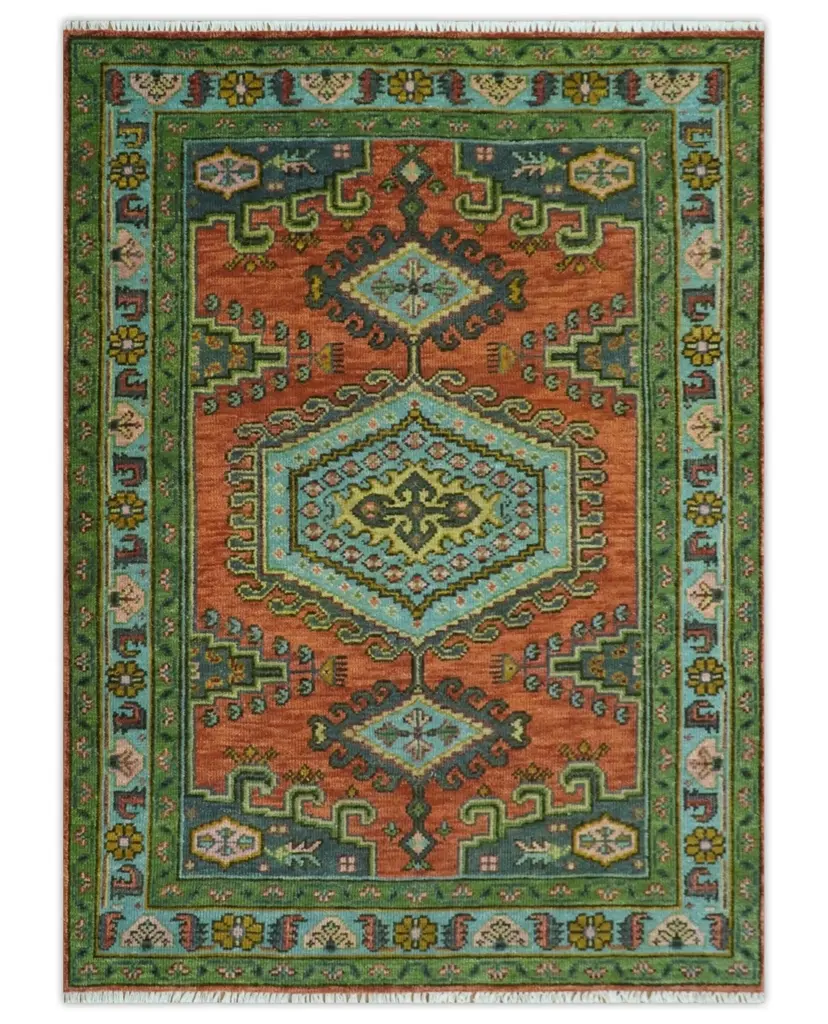 This Hand-Knotted Rug has been Made with Handspun Wool. The beautiful colors of the rug carry a legacy of the heirloom rug. The traditional design of the rug completes your space without making it look busy. Hand-Knotted rugs are durable and can last for decades if treated right. Hand-Knotted Rug 8x10 is ready to ship and other sizes are made to order in 30 days Made with Wool Color: Rust, Blue and Olive Made with 28 knots per square inch This specific rug is made in India, in the city of Bhadohi. Bhadohi is one of the biggest rug manufacturing cities. Carpet weaving in the region dates back to the 16th century during the reign of Akbar. The skilled artisans of Bhadohi have been carrying the tradition of rug-making for centuries. USERS GUIDE Avoid prolonged moisture Vacuum regularly and/or shake to remove dust Do not pull any loose threads. Use scissors to simply cut the ends Blot spills immediately with a white cloth. Harsh chemicals may damage or fade the rug Use rug protectors under heavy furniture