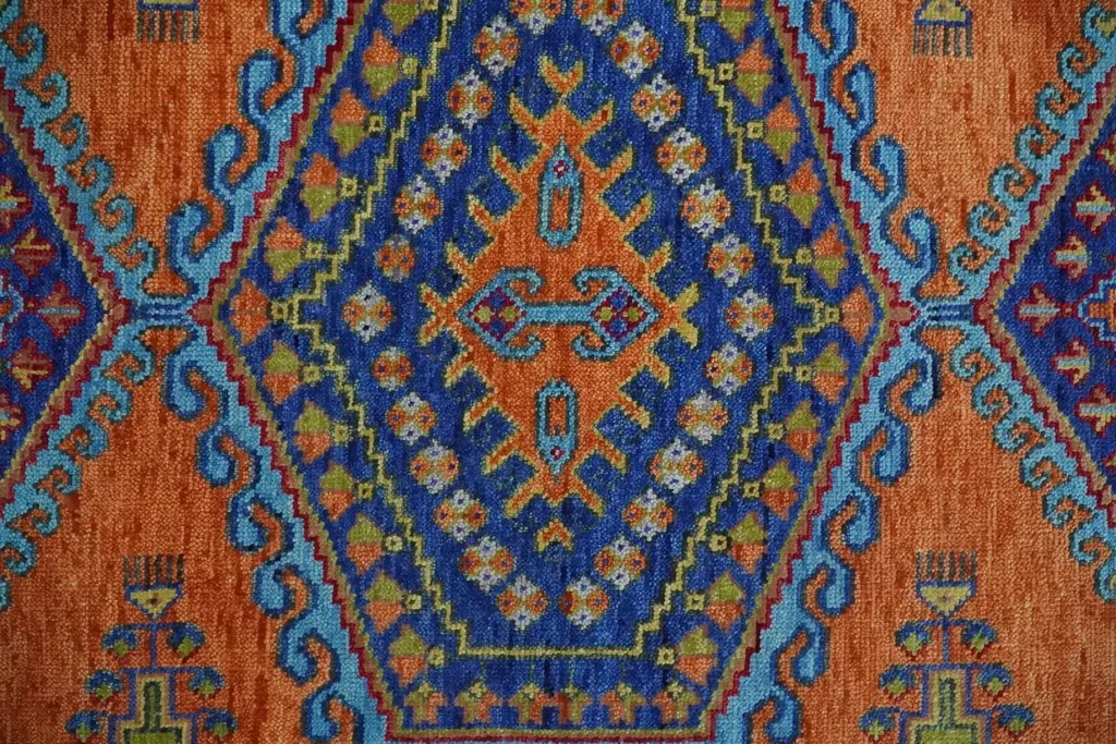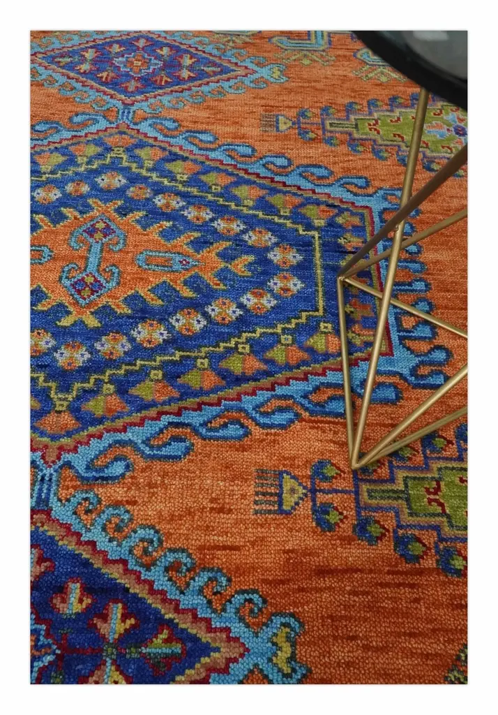 This luxurious rug features a vibrant fusion of orange, blue, and green hues, creating a rich tapestry of color. At its heart lies an intricate geometric medallion, bordered by a series of ornate, symmetrical motifs that suggest cultural influences. The texture is plush and inviting, indicative of high-quality craftsmanship. The blue and green borders are adorned with floral designs, adding elegance and sophistication. This piece expertly blends traditional aesthetics with contemporary allure, making it a striking centerpiece for any opulent interior. Product Details Color: Rust, Blue, and Olive Design: Antique Material: Wool Construction: Hand-Knotted Knots Per Inch (KPI): 25 Availability: Made to order in 30 days Size Options: Custom sizing Care Guide Vacuum regularly and shake to remove dust Avoid prolonged moisture exposure Blot spills immediately with a white cloth Use scissors to trim loose threads instead of pulling Avoid harsh chemicals to maintain color vibrancy Use rug protectors under heavy furniture