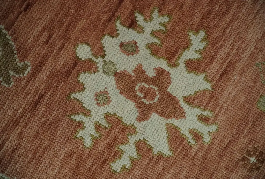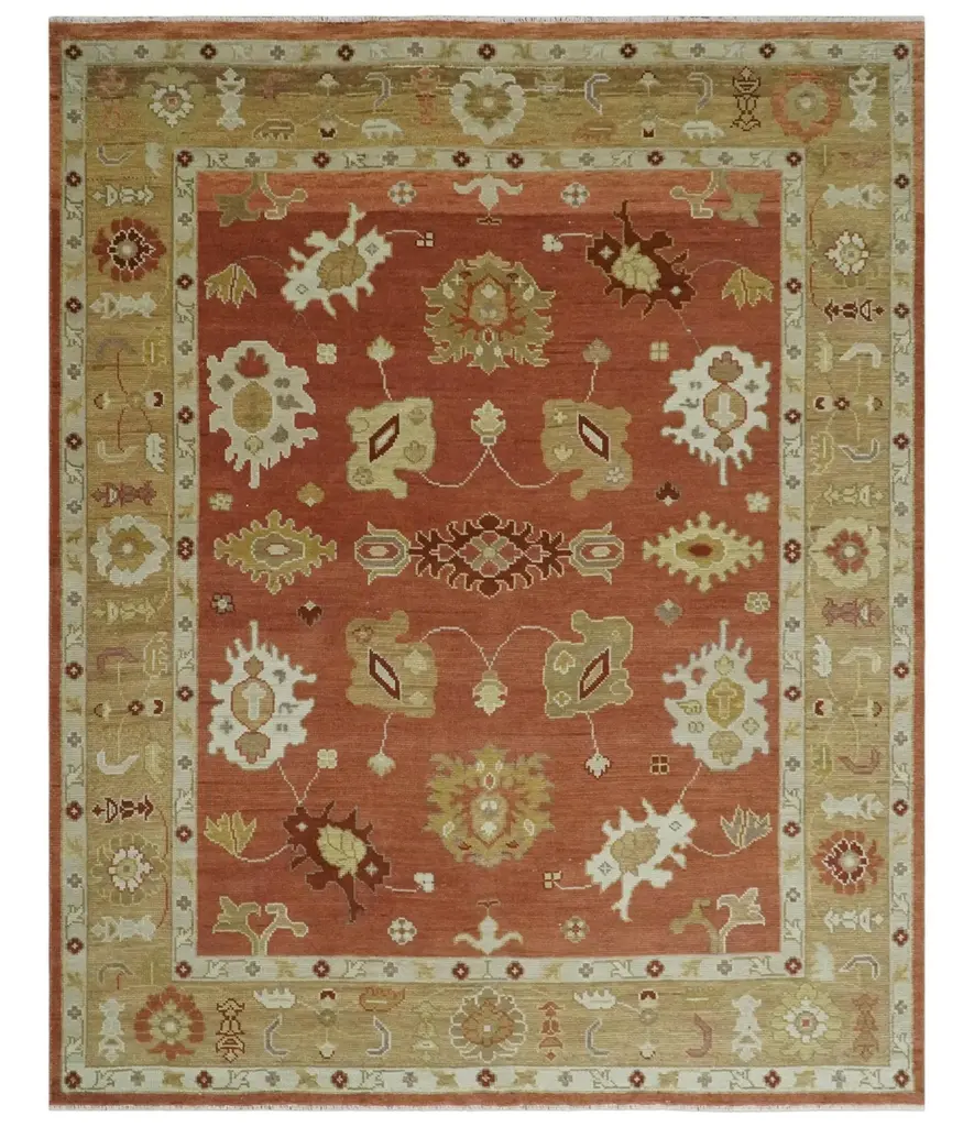 This stylish handmade wool rug is the perfect addition to your traditional home decor. Featuring a classic Oushak design in shades of rust, olive, and ivory, this rug is exquisitely hand knotted for lasting durability and superior quality. Ideal for creating a timeless, luxurious ambiance. Hand-Knotted SIZES ARE MADE TO ORDER IN 30-60 DAYS Made with Wool Color : Rust, Olive, and Ivory Made with 28 knots per square inch Oushak rugs have been made for centuries and carry a tradition and art. This specific rug is made in India, in the city of Bhadohi. Bhadohi is one of the biggest rug manufacturing cities. Carpet weaving in the region dates back to the 16th century during the reign of Akbar. The skilled artisans of Bhadohi have been carrying the tradition of rug-making for centuries. USERS GUIDE Avoid prolonged moisture Vacuum regularly and/or shake to remove dust Do not pull any loose threads. Use scissors to simply cut the ends Blot spills immediately with a white cloth. Harsh chemicals may damage or fade the rug Use rug protectors under heavy furniture