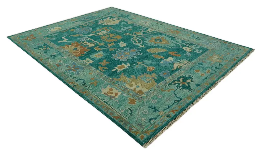 This Hand Knotted Teal Traditional Oushak Multi-size wool area rug is a beautiful and durable addition to any space. Made with high-quality wool, it is both soft and long-lasting. The traditional Oushak design adds elegance and the multi-size option allows for versatile use. Hand-knotted with expert craftsmanship ensures a true work of art. Hand-Knotted Made with Wool Made to Order in 30-45 Days Color: Teal Made with 22 knots per Square inch USERS GUIDE Avoid prolonged moisture Vacuum regularly and/or shake to remove dust Do not pull any loose threads. Use scissors to simply cut the ends The blot spills immediately with a white cloth. Harsh chemicals may damage or fade the rug Use rug protectors under heavy furniture
