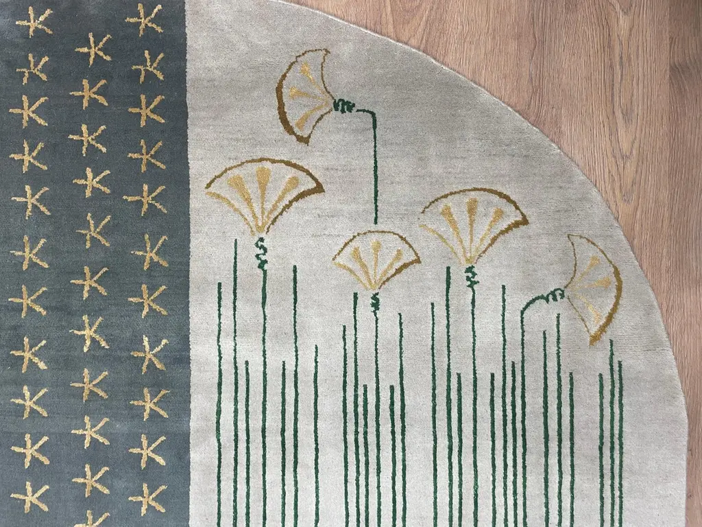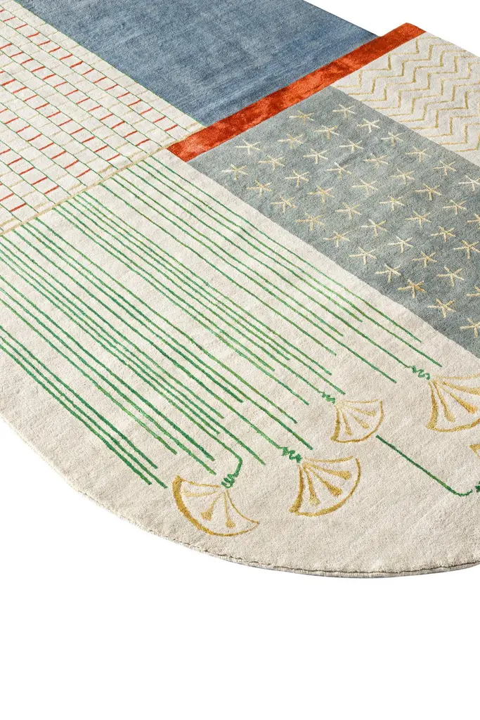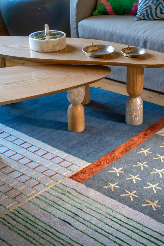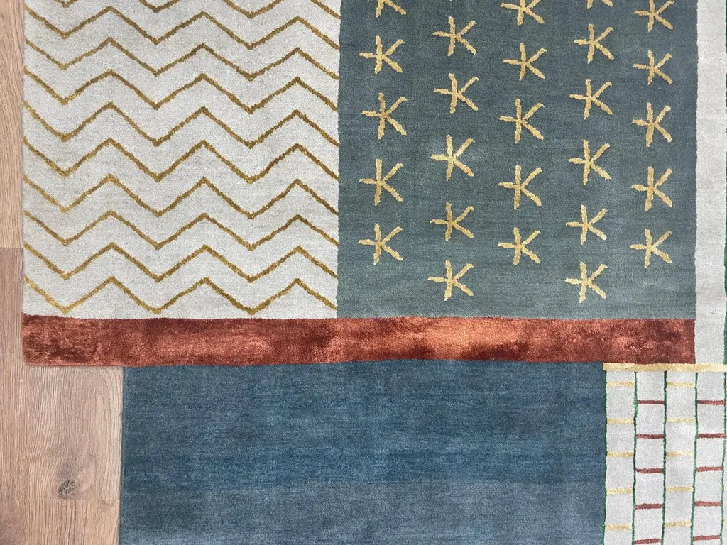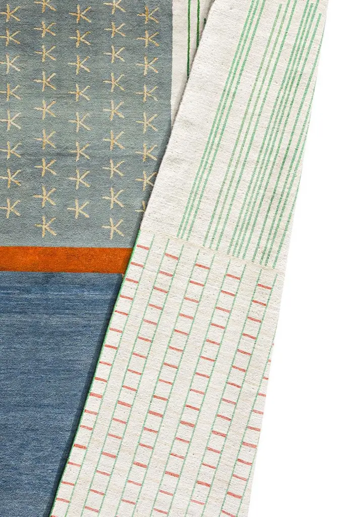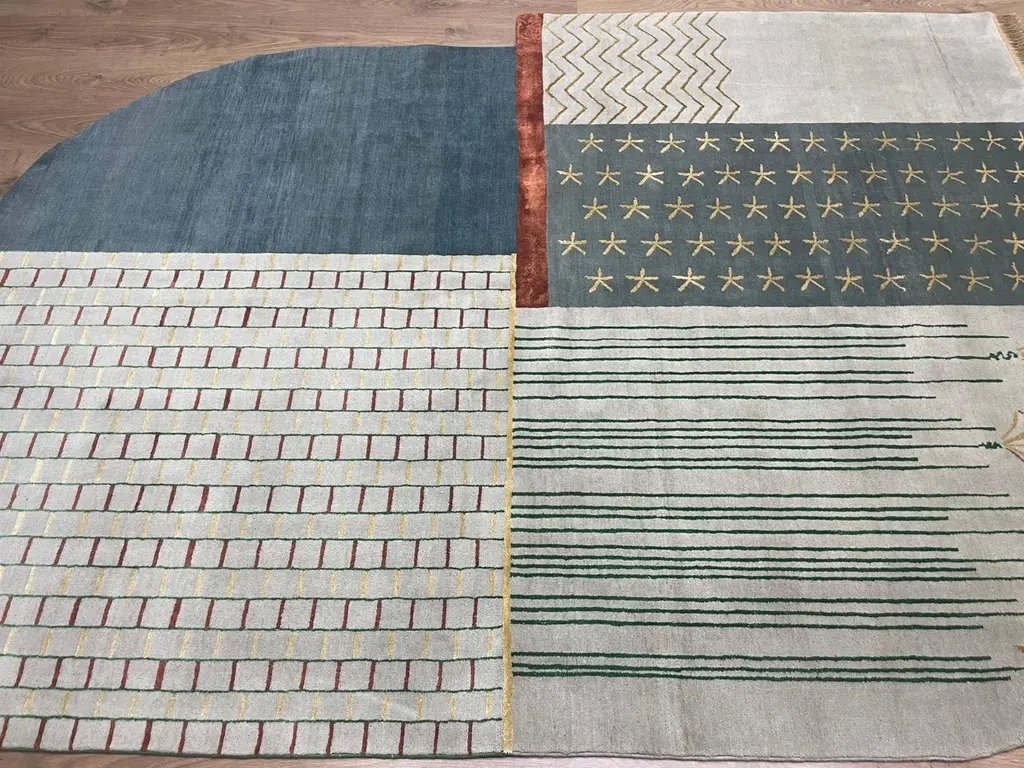 For the more adventurous soul, in our Blue Blossom carpet Shewekar ventures into more heritage and art. Patchwork takes on a new meaning as the swaying Lotus flower is contrasted with the Ancient Egyptian geometric depiction of the flowing river Nile, and the gold stars famously drawn on tombs’ ceilings representing the heavens and afterlife. Mostly in hues of blue and grey, the design is beautifully interrupted with deep crimson lines for an added touch of warmth. Note: Due to the intricate handmade process of weaving and dyeing of colors, rugs of this type are truly one-of-a-kind. Each rug has a unique personality, no two rugs are exactly the same. Technical Details: - Construction: Hand Knotted - Quality: 160,000 knots per square meter - Face Yarn: 100% Egyptian Wool with Bamboo Silk inlays - Pile Height: +/- 6mm - Warp: 100% Egyptian Cotton - Weft: 100% Egyptian Cotton - Net Weight: Approximately 3000 grams per square meter.