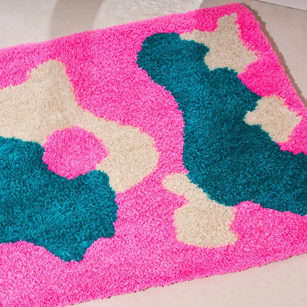 Hand tufted cut-pile rug in an abstract cow print.I design & hand tuft all of my pieces, it is truly art for your floor. It can also be used as a wall hanging!Acrylic yarnMeasures: 5 feet x 7 feetCustomizations available.