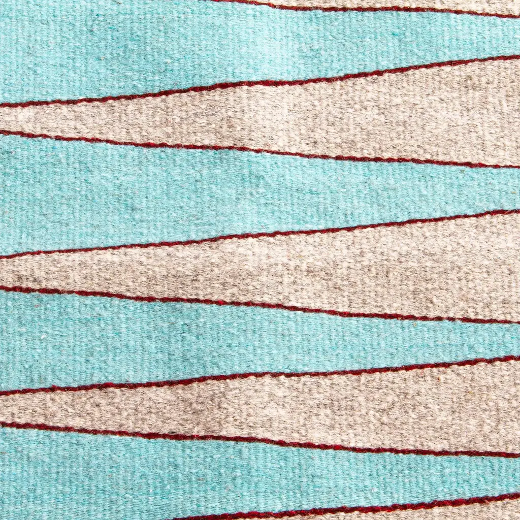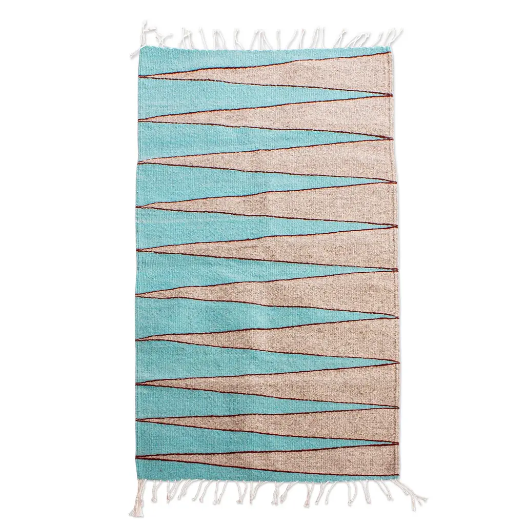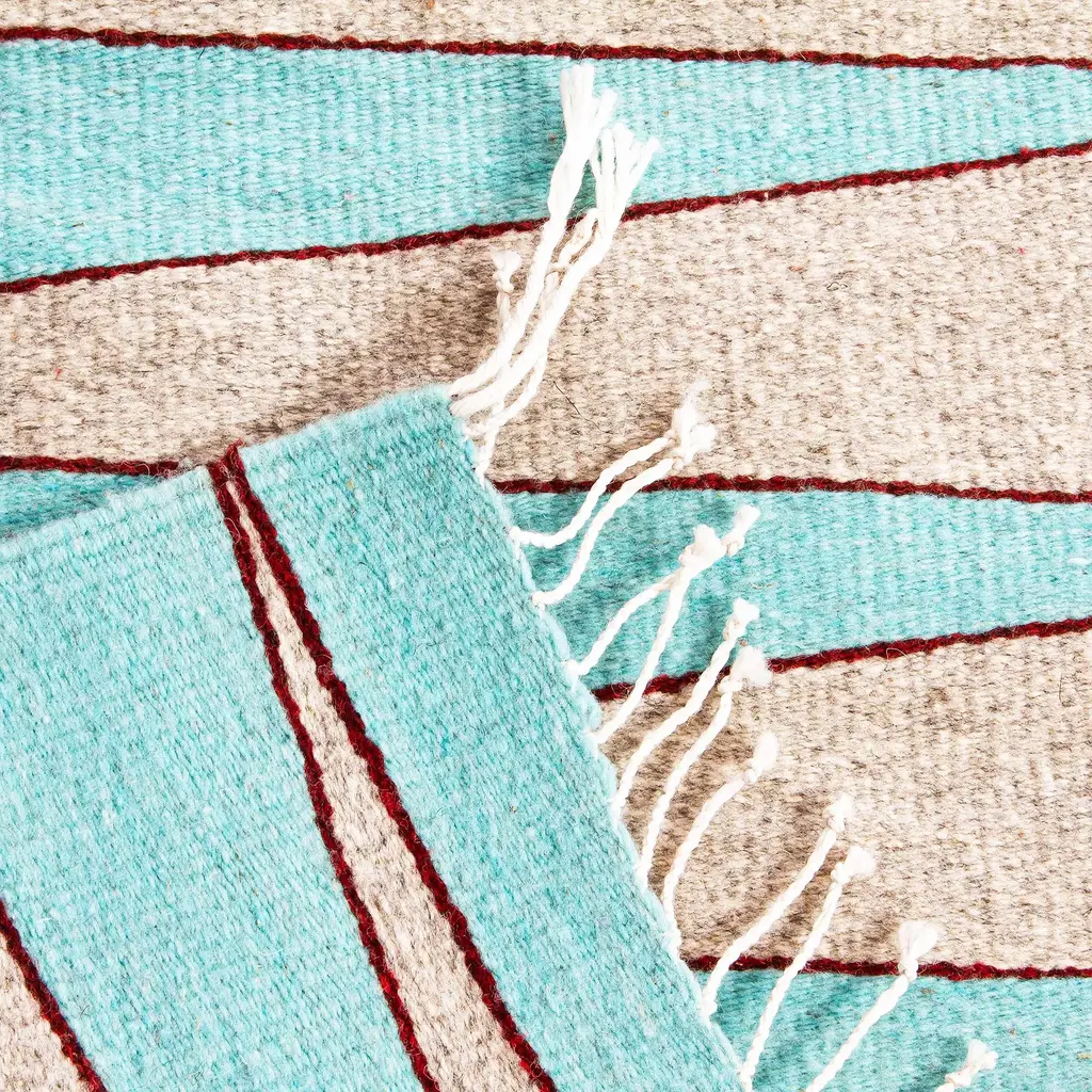 This bold area rug is designed and crafted by Mexico's Marco Bautista. The 100% wool rug is hand-woven on a traditional loom in aqua and smoky beige with accents of brick red.