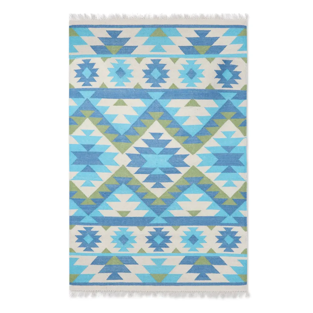Parvez Alam in India celebrates the magical beauty of the of the rolling hills and seas of India with the pattern on his handwoven wool rug. Alam's preferred weaving technique, called kilim, is characterized by small, straight stitches that form a flat pile. The rug is crafted from 100% wool stitches and a cotton warp with a stylish row of fringe on either end.