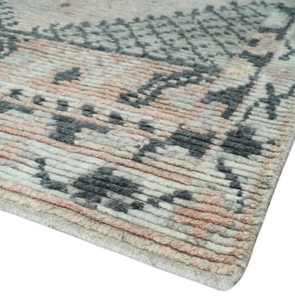 This beautiful hand-woven rug is made of durable blended wool with a beautiful peach, beige, and charcoal color palette. It's available in multiple sizes, making it a great choice for any room in your home. Hand-Knotted SIZES ARE MADE TO ORDER IN 30-45 DAYS Made with Wool Color: Peach, Beige, and Charcoal Made with 28 knots per square inch This specific rug is made in India, in the city of Bhadohi. Bhadohi is one of the biggest rug manufacturing cities. Carpet weaving in the region dates back to the 16th century during the reign of Akbar. The skilled artisans of Bhadohi have been carrying the tradition of rug-making for centuries. USERS GUIDE Avoid prolonged moisture Vacuum regularly and/or shake to remove dust Do not pull any loose threads. Use scissors to simply cut the ends The blot spills immediately with a white cloth. Harsh chemicals may damage or fade the rug Use rug protectors under heavy furniture