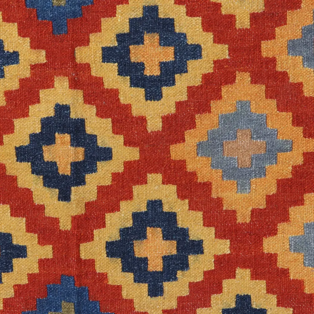 Welcome a little bit of magic into your home with Ashfaq Ahmed's beautiful area rug, which takes up to five days to complete. Woven by Indian artisans on a traditional handloom, the wool rug features a bright geometric pattern with a cotton warp, along with a row of playful fringe on either end.