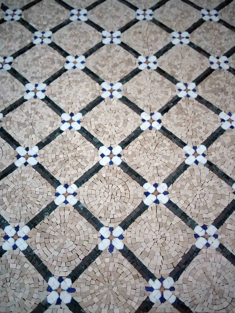 This exquisite Victorian mosaic rug is a testament to the power of collaboration and bespoke design. Our client, a discerning homeowner with a passion for Victorian aesthetics, envisioned a floor covering that would seamlessly blend historical charm with modern elegance. Working closely with our client, our skilled artisans meticulously translated their vision into this stunning reality. Handcrafted from natural marble and stone, the rug showcases a captivating geometric pattern inspired by traditional Victorian tilework. The intricate lattice design, composed of meticulously arranged tesserae, creates a sense of depth and visual intrigue. A delicate floral border, reminiscent of Victorian wallpaper motifs, frames the central pattern, adding a touch of softness and organic beauty. The harmonious blend of colors, including warm creams, earthy browns, and deep greens, evokes the rich palette characteristic of the Victorian era. This one-of-a-kind mosaic rug is not only a beautiful work of art but also a durable and functional floor covering. It's sure to become a cherished centerpiece in any home, adding a touch of timeless elegance and historical significance.
