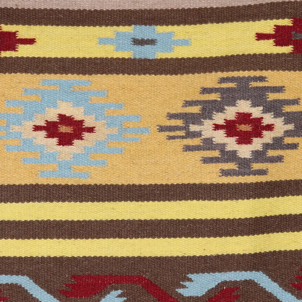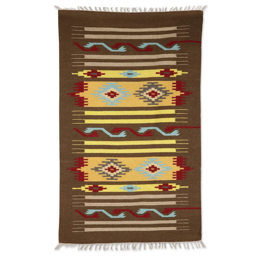 Handloomed by Indian artisans and presented by Sonik Sethi, this brown area rug features geometric motifs with little snake-like formations for a merry touch. Working with wool yarns, the artisans create a cute pattern that is further enhanced with playful fringes at each end.