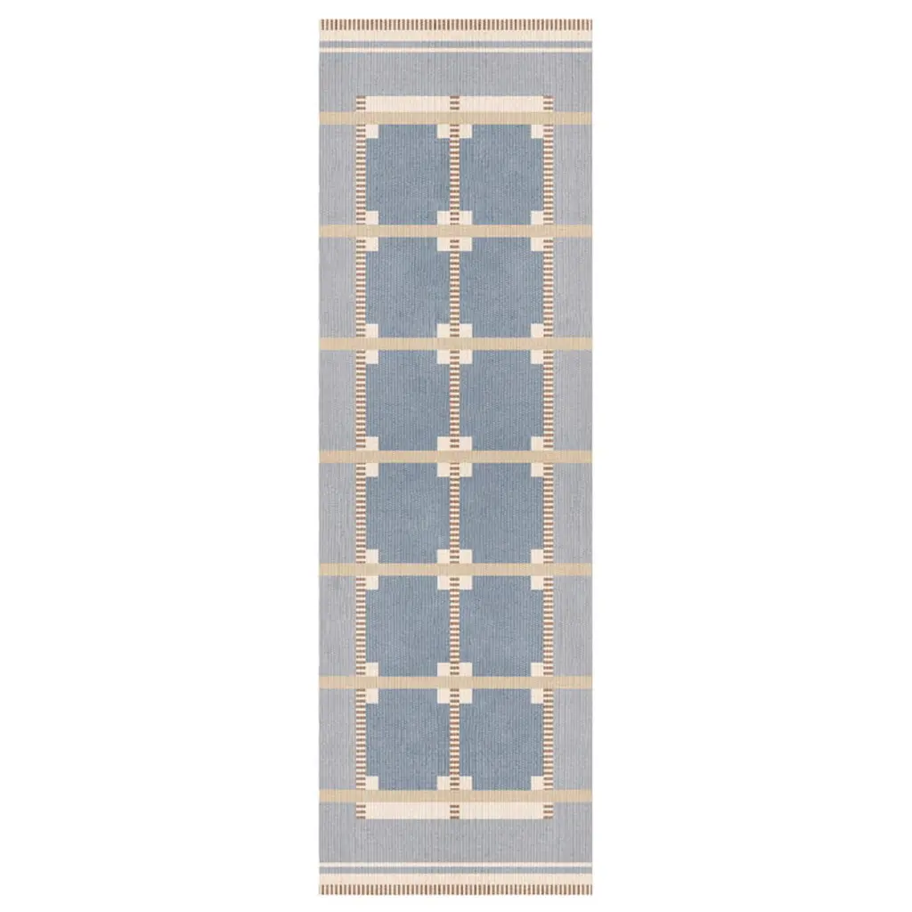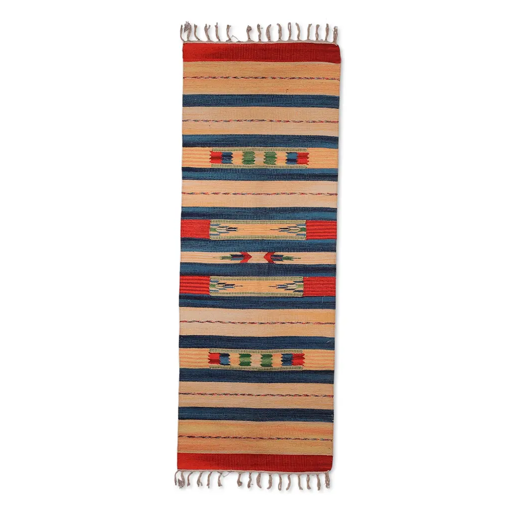 Wondrous stripes invite your spaces to discover the beauty of India's dhurrie rugs. Mahmood's newest piece is woven by local artisans, using refined cotton yarns to create the avant-garde pattern. Beige, blue, and red hues add color to the piece, whereas fringes crown the rug with a bold vibe.