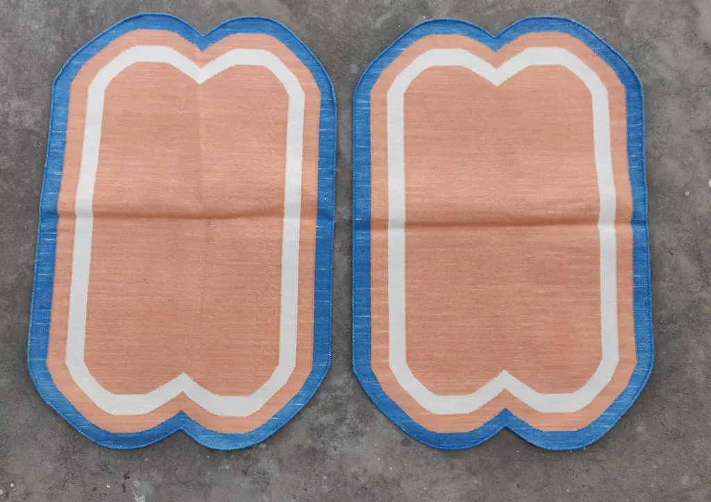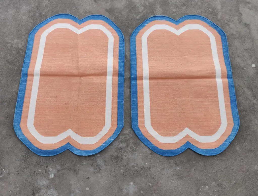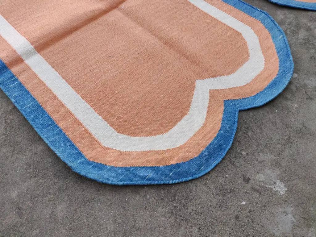 Handmade Cotton Area Flat Weave Rug, 2X3 Coral And Blue Scalloped Indian Dhurrie