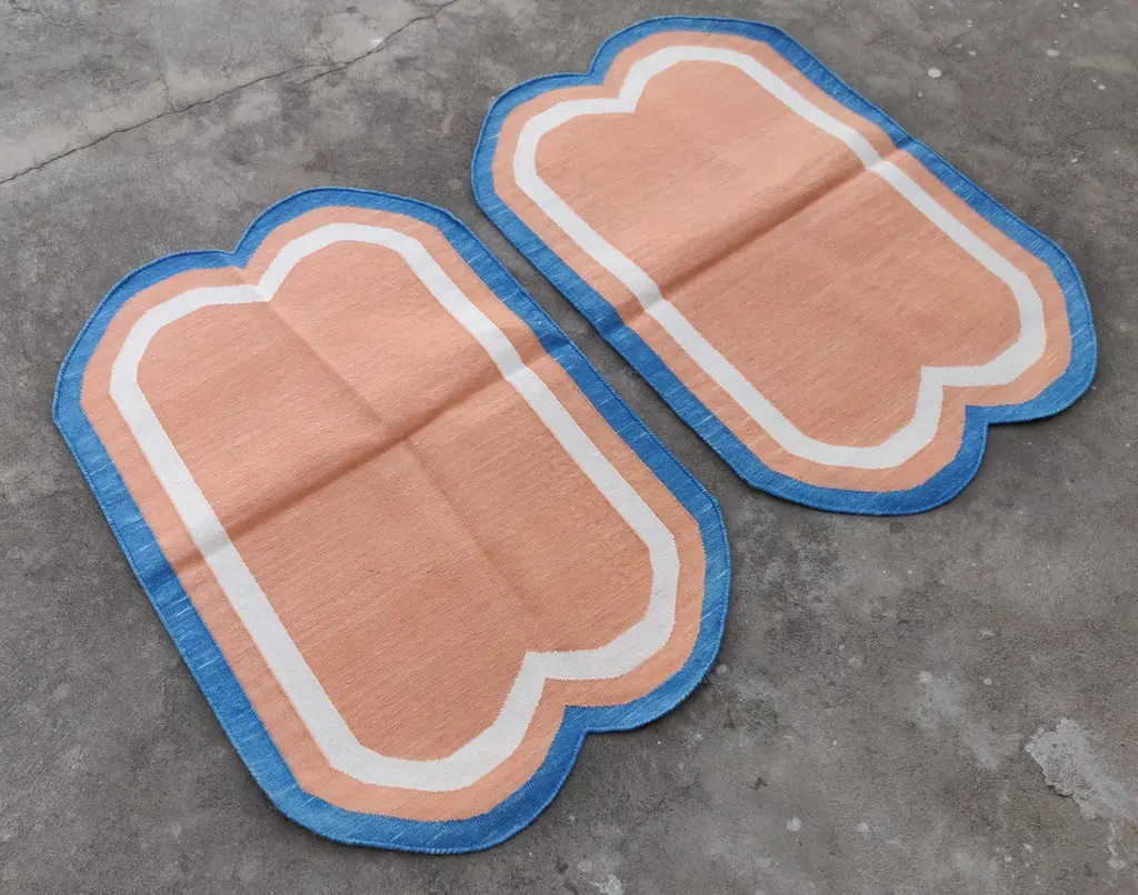 Cotton Vegetable Dyed Coral, Cream And Blue Scalloped Striped Indian Dhurrie Rug - 2'x3' (60x90cm) These special flat-weave dhurries are hand-woven with 15 ply 100% cotton yarn. Due to the special manufacturing techniques used to create our rugs, the size and color of each piece may vary a little. The striking colour is achieved using natural vegetable dyes. We recommend that rugs are always used with an anti-slip underlay. Rugs should be regularly brushed or hovered with a suction-only appliance to prevent the build-up of damaging dust and grit. To avoid fading over time, rotate and flip your rug regularly.We recommend that rugs are always used with an anti-slip underlay. Rugs should be regularly brushed or hovered with a suction-only appliance to prevent the build-up of damaging dust and grit. To avoid fading over time, rotate and flip your rug regularly.Please note - due to the handmade nature of this rug, size variations of 2-3 inches are to be expected (both length and/or width). The rugs are washed by hand in an iron frame so often the size is increased after washing. As a result, the finished rug size may be slightly longer or wider than the dimensions listed.