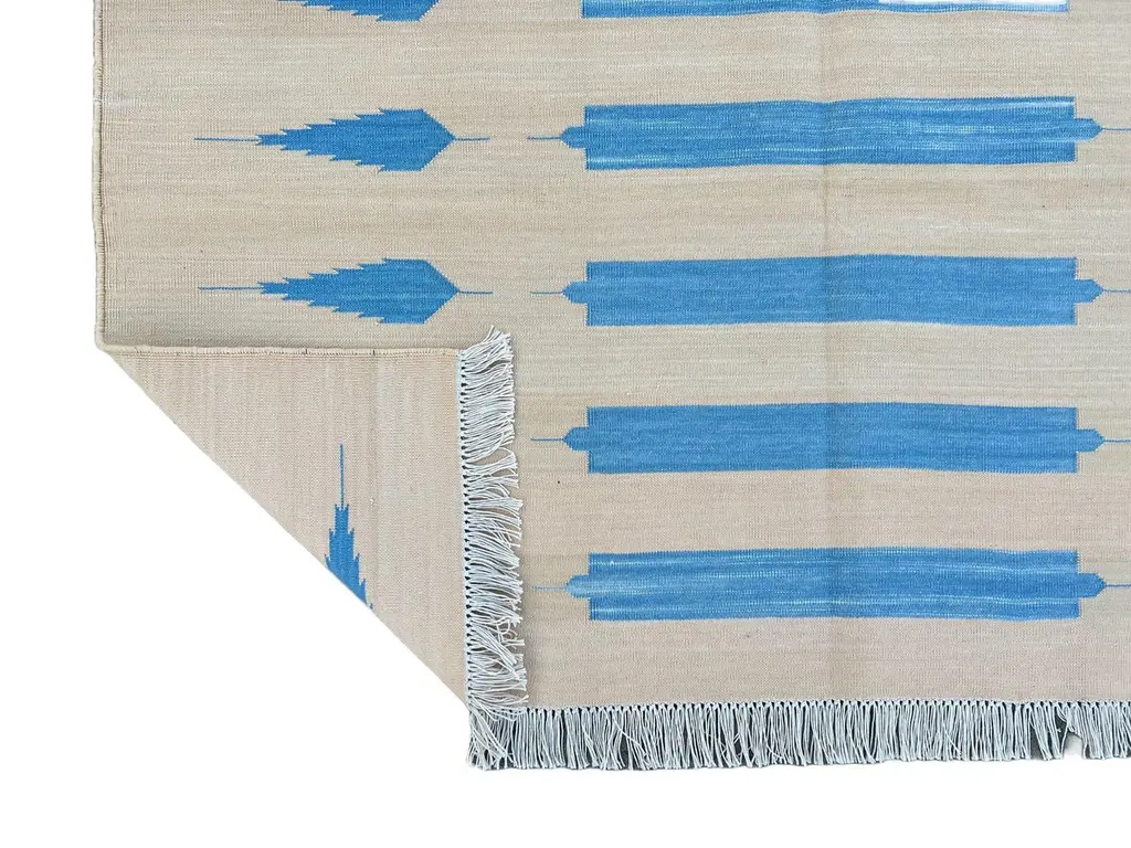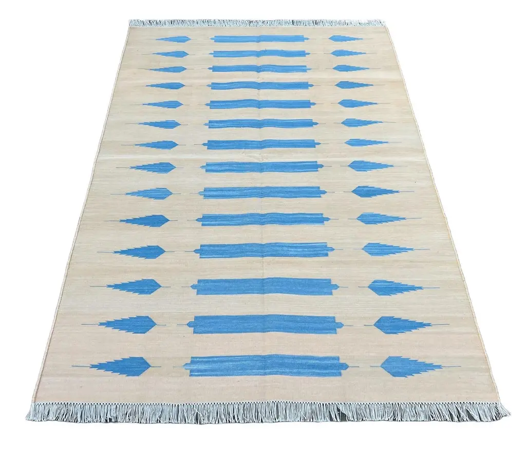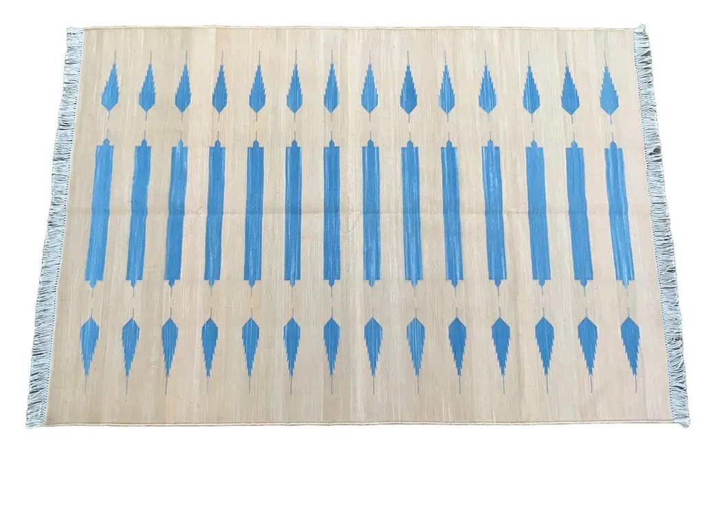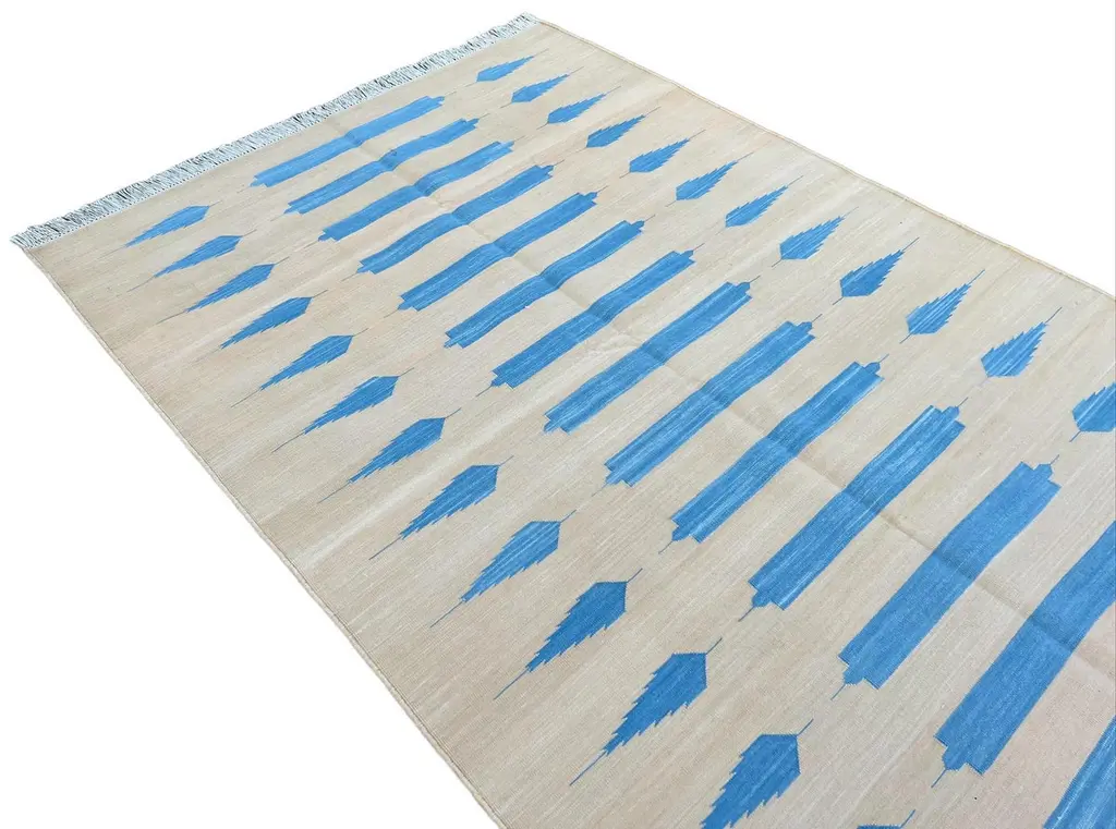 Cotton Vegetable Dyed Cream And Blue Striped Indian Dhurrie Rug-4'x6' These special flat-weave dhurries are hand-woven with 15 ply 100% cotton yarn. Due to the special manufacturing techniques used to create our rugs, the size and color of each piece may vary a little. The striking colour is achieved using natural vegetable dyes. We recommend that rugs are always used with an anti-slip underlay. Rugs should be regularly brushed or hovered with a suction-only appliance to prevent the build-up of damaging dust and grit. To avoid fading over time, rotate and flip your rug regularly.We recommend that rugs are always used with an anti-slip underlay. Rugs should be regularly brushed or hovered with a suction-only appliance to prevent the build-up of damaging dust and grit. To avoid fading over time, rotate and flip your rug regularly.Please note - due to the handmade nature of this rug, size variations of 2-3 inches are to be expected (both length and/or width). The rugs are washed by hand in an iron frame so often the size is increased after washing. As a result, the finished rug size may be slightly longer or wider than the dimensions listed.
