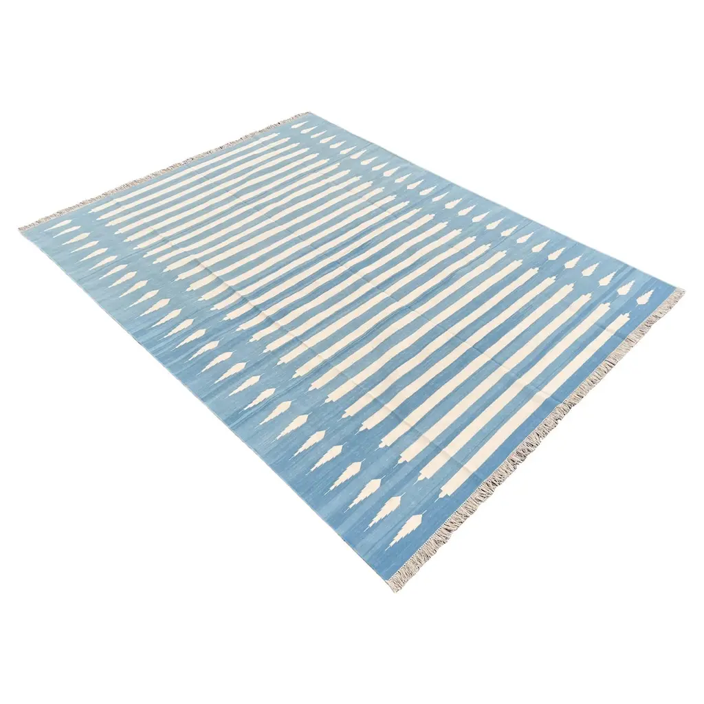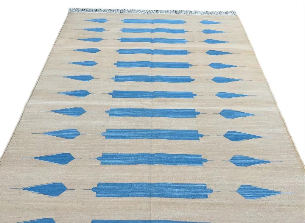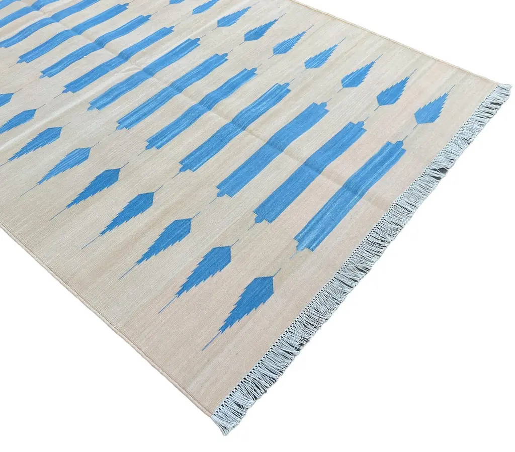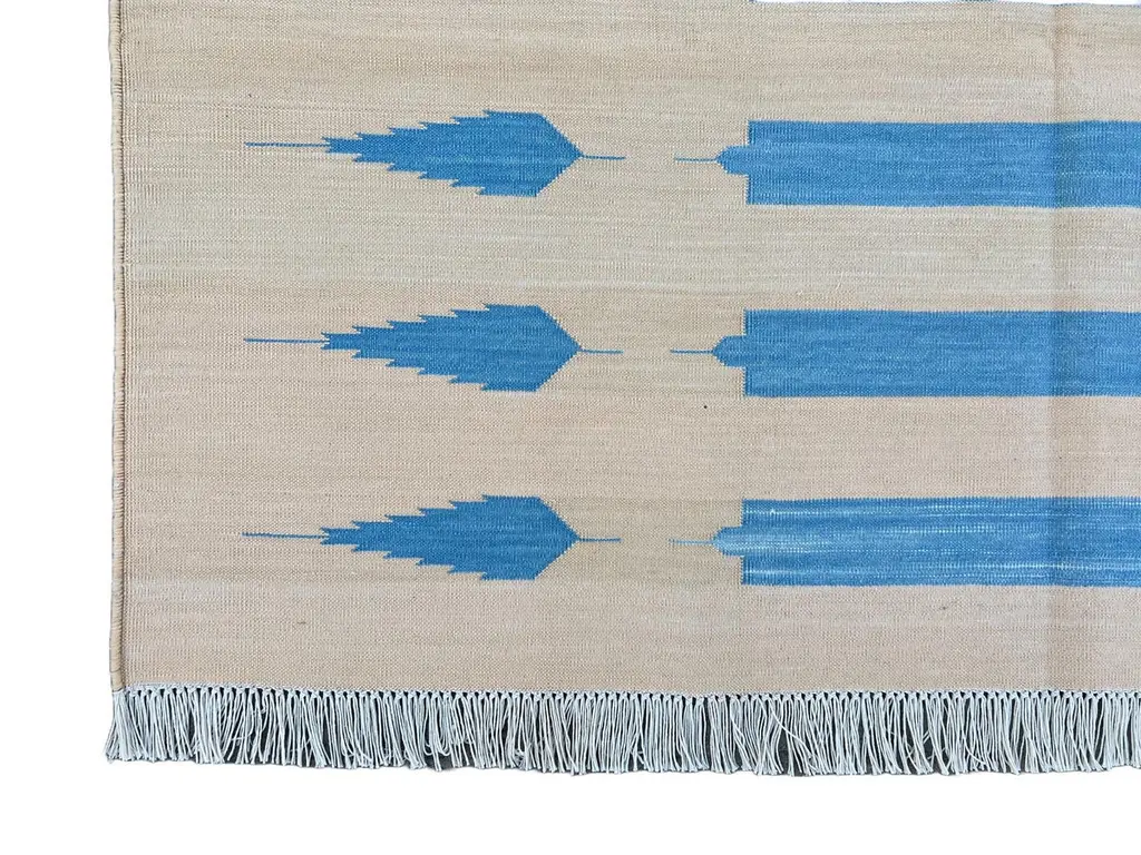 Cotton Vegetable Dyed Cream And Blue Striped Indian Dhurrie Rug-4'x6' These special flat-weave dhurries are hand-woven with 15 ply 100% cotton yarn. Due to the special manufacturing techniques used to create our rugs, the size and color of each piece may vary a little. The striking colour is achieved using natural vegetable dyes. We recommend that rugs are always used with an anti-slip underlay. Rugs should be regularly brushed or hovered with a suction-only appliance to prevent the build-up of damaging dust and grit. To avoid fading over time, rotate and flip your rug regularly.We recommend that rugs are always used with an anti-slip underlay. Rugs should be regularly brushed or hovered with a suction-only appliance to prevent the build-up of damaging dust and grit. To avoid fading over time, rotate and flip your rug regularly.Please note - due to the handmade nature of this rug, size variations of 2-3 inches are to be expected (both length and/or width). The rugs are washed by hand in an iron frame so often the size is increased after washing. As a result, the finished rug size may be slightly longer or wider than the dimensions listed.