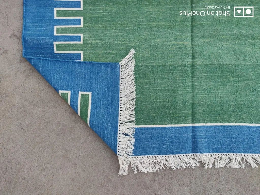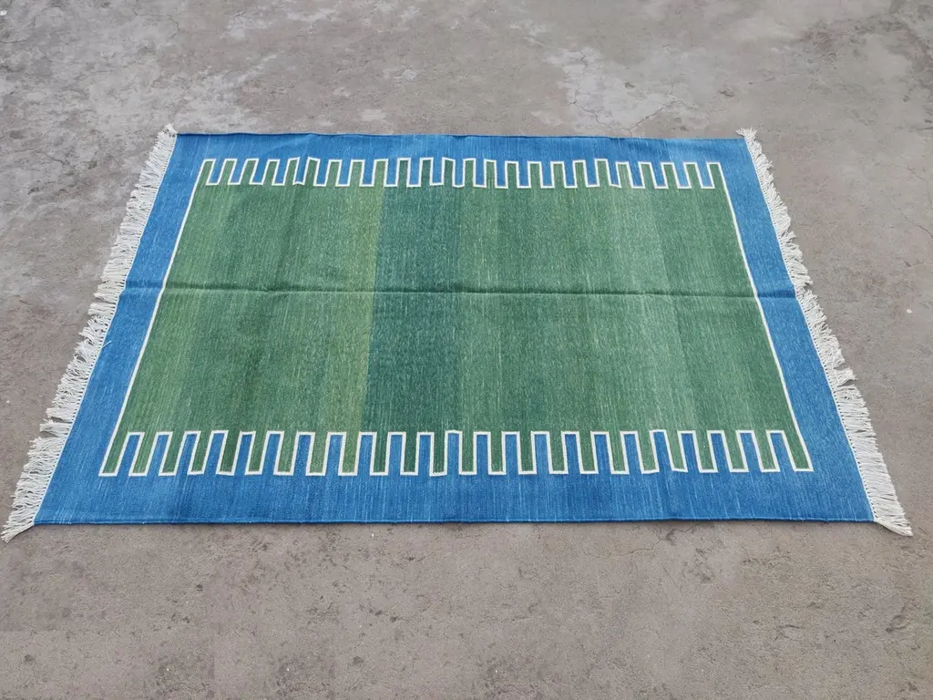 Cotton Vegetable Dyed Forest Green, Cream And Blue Zig Zag Striped Indian Dhurrie Rug-4'x6' (120x180cm)These special flat-weave dhurries are hand-woven with 15 ply 100% cotton yarn. Due to the special manufacturing techniques used to create our rugs, the size and color of each piece may vary a little. The striking colour is achieved using natural vegetable dyes. We recommend that rugs are always used with an anti-slip underlay. Rugs should be regularly brushed or hovered with a suction-only appliance to prevent the build-up of damaging dust and grit. To avoid fading over time, rotate and flip your rug regularly.We recommend that rugs are always used with an anti-slip underlay. Rugs should be regularly brushed or hovered with a suction-only appliance to prevent the build-up of damaging dust and grit. To avoid fading over time, rotate and flip your rug regularly.Please note - due to the handmade nature of this rug, size variations of 2-3 inches are to be expected (both length and/or width). The rugs are washed by hand in an iron frame so often the size is increased after washing. As a result, the finished rug size may be slightly longer or wider than the dimensions listed.