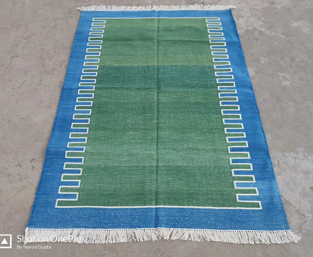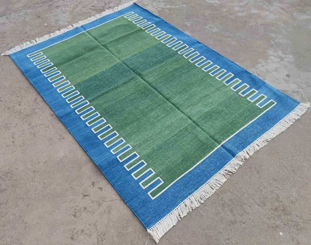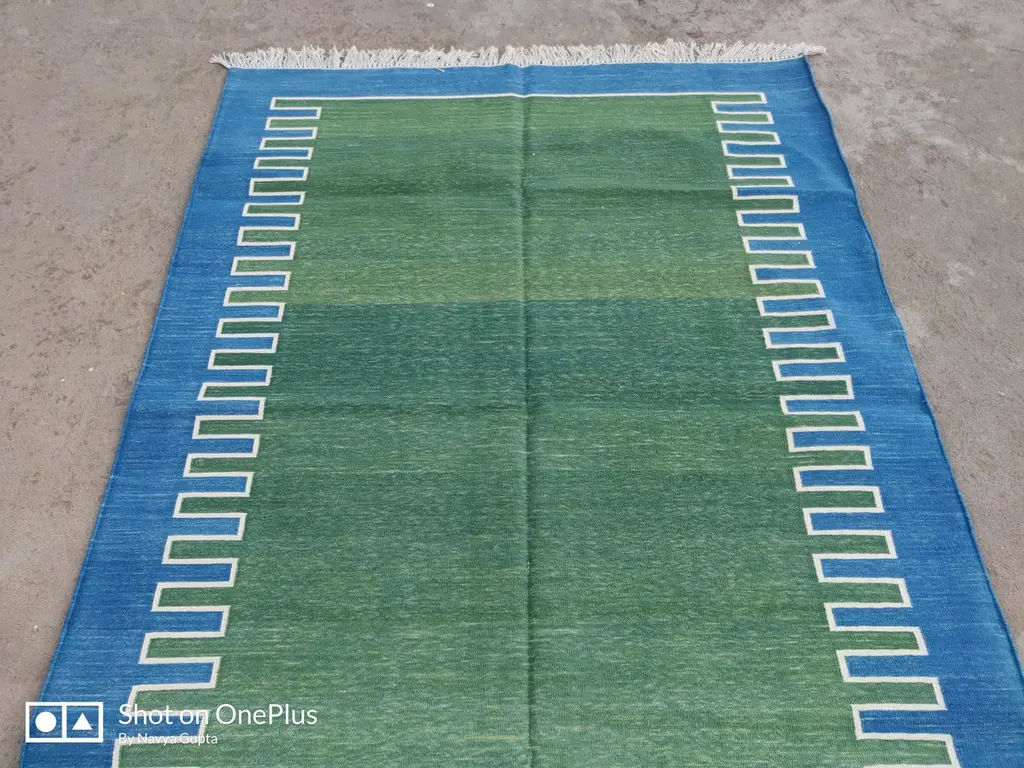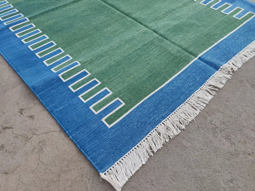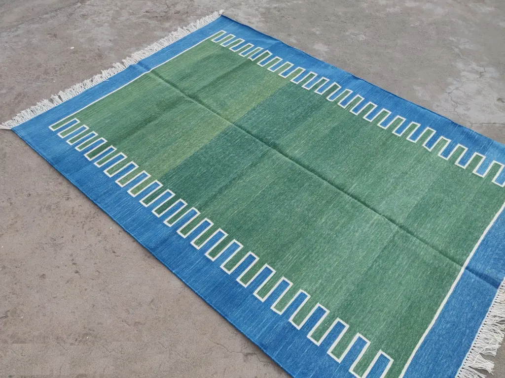 Handmade Cotton Area Flat Weave Rug, 4X6 Green And Blue Striped Indian Dhurrie