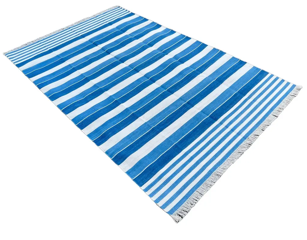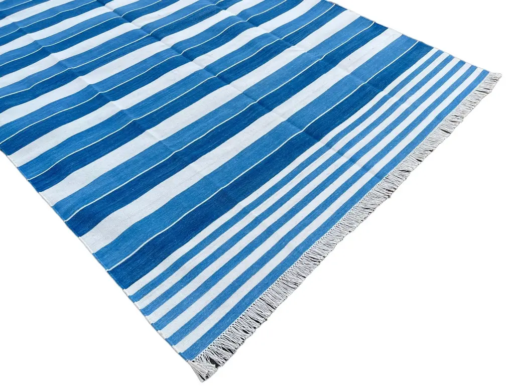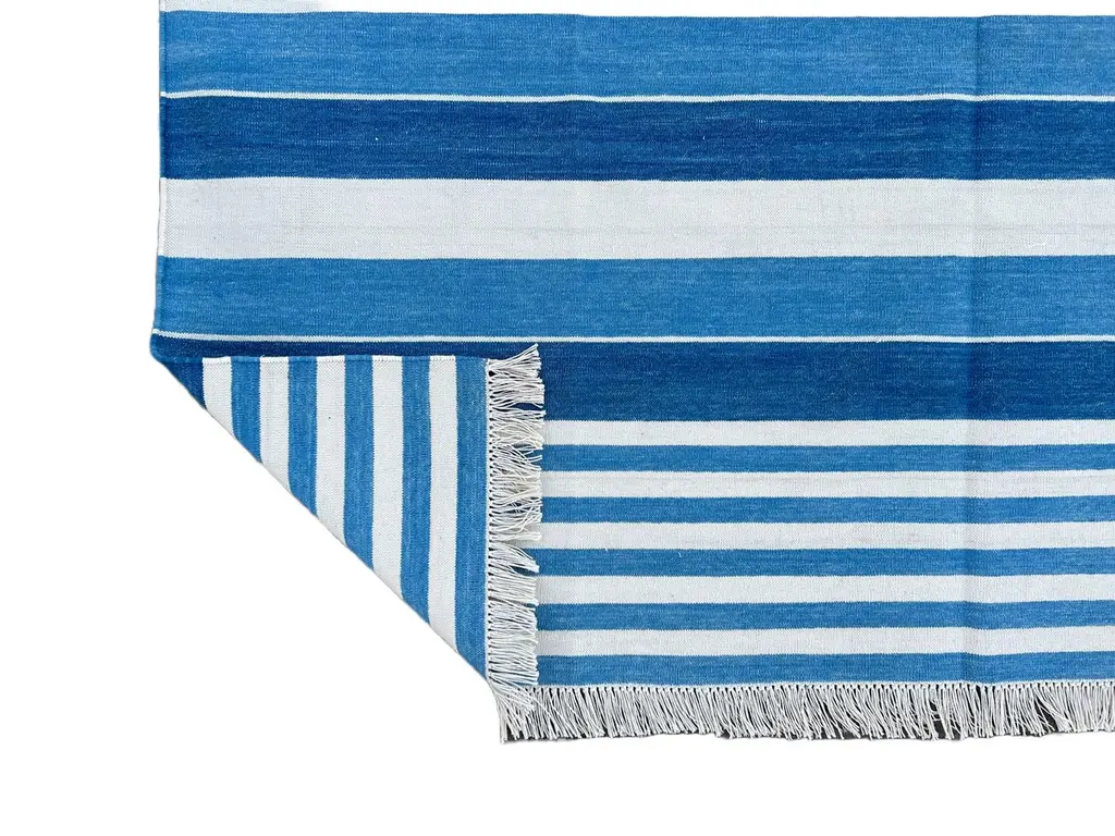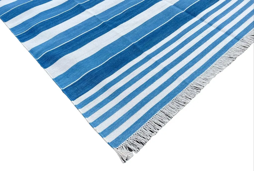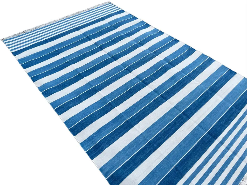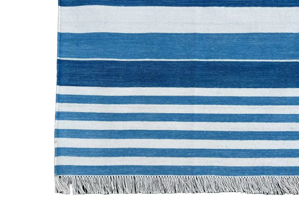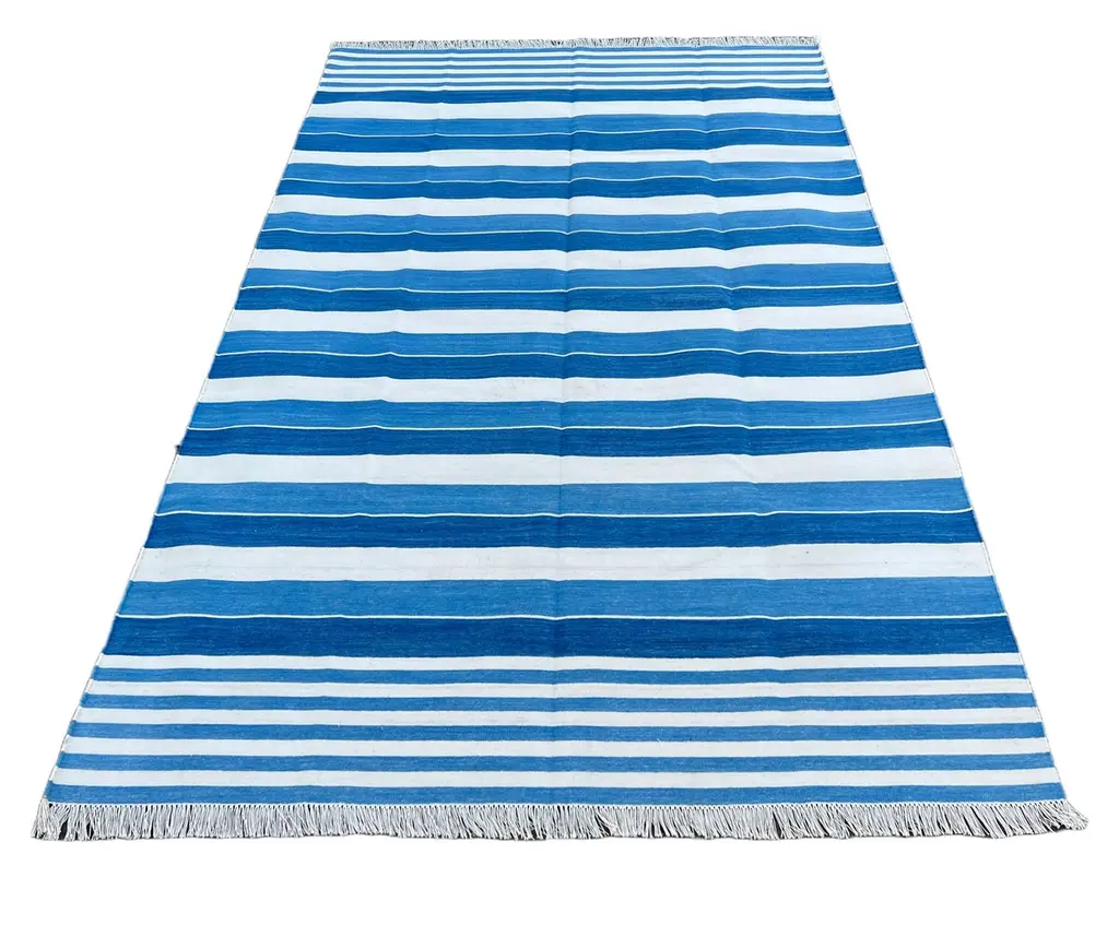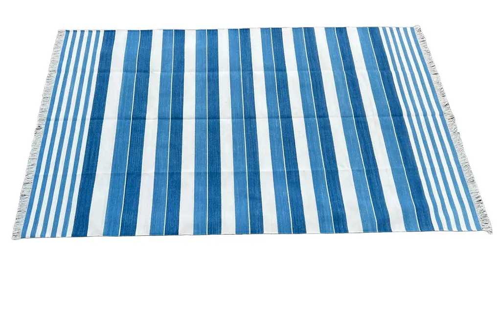 Cotton Vegetable Dyed Blue And White Striped Indian Dhurrie Rug - 6'x9' (180x270cm) These special flat-weave dhurries are hand-woven with 15 ply 100% cotton yarn. Due to the special manufacturing techniques used to create our rugs, the size and color of each piece may vary a little. The striking colour is achieved using natural vegetable dyes. We recommend that rugs are always used with an anti-slip underlay. Rugs should be regularly brushed or hovered with a suction-only appliance to prevent the build-up of damaging dust and grit. To avoid fading over time, rotate and flip your rug regularly.We recommend that rugs are always used with an anti-slip underlay. Rugs should be regularly brushed or hovered with a suction-only appliance to prevent the build-up of damaging dust and grit. To avoid fading over time, rotate and flip your rug regularly.Please note - due to the handmade nature of this rug, size variations of 2-3 inches are to be expected (both length and/or width). The rugs are washed by hand in an iron frame so often the size is increased after washing. As a result, the finished rug size may be slightly longer or wider than the dimensions listed.