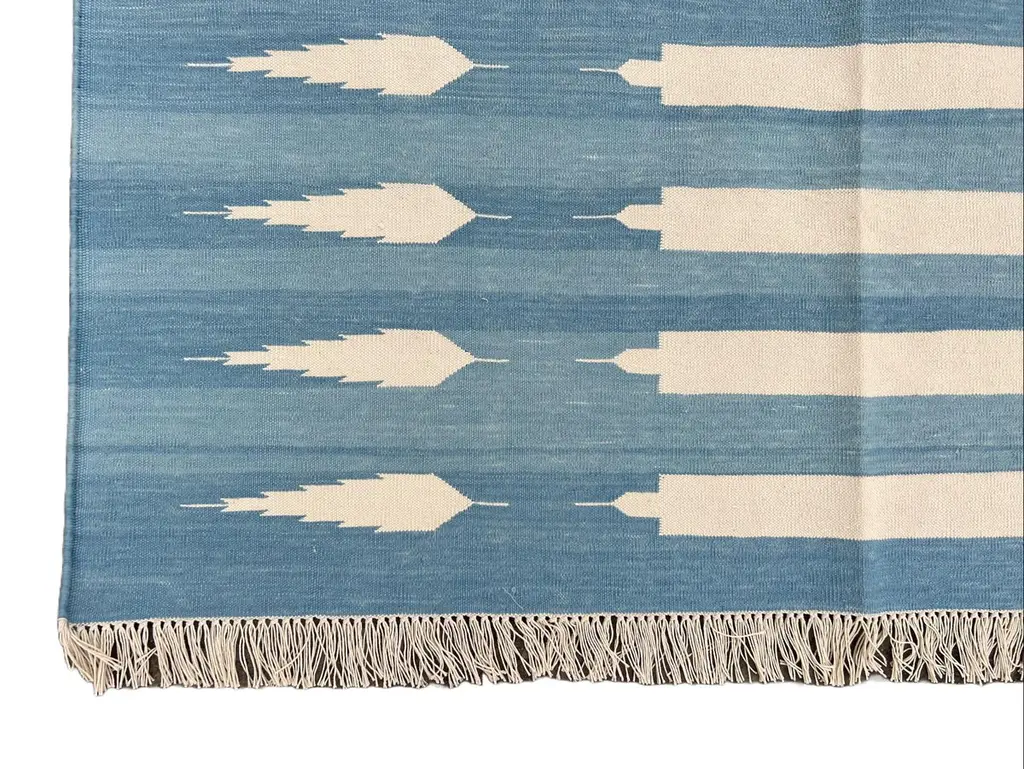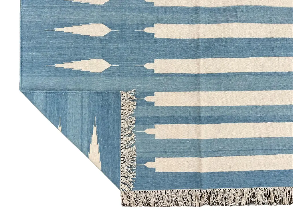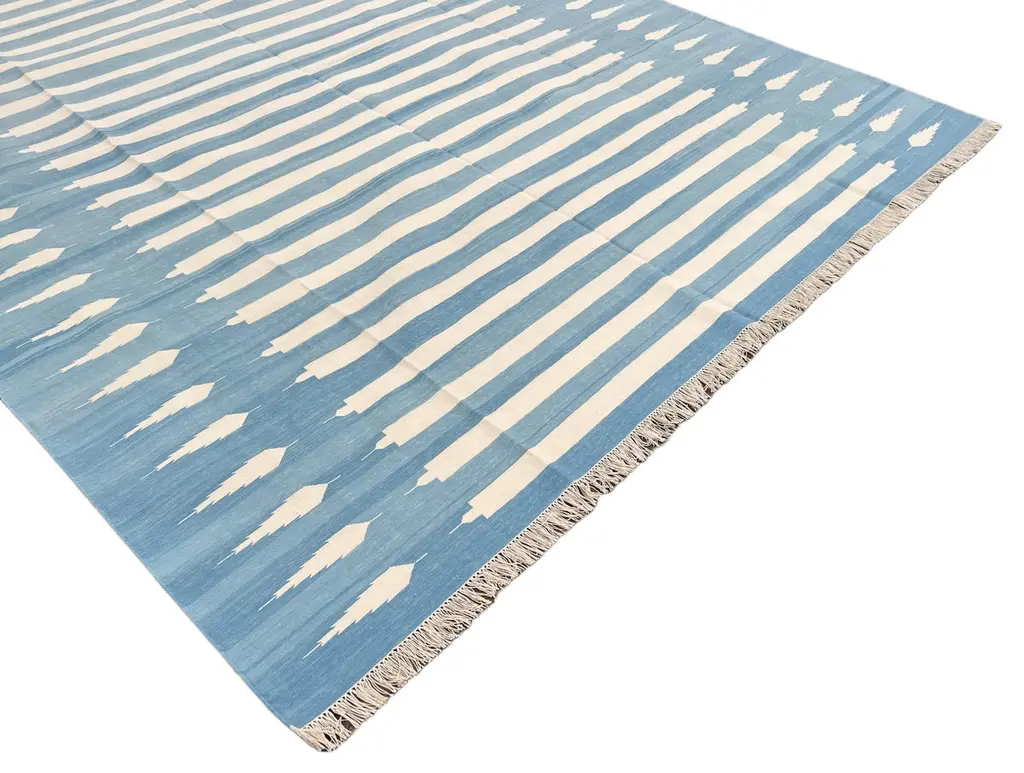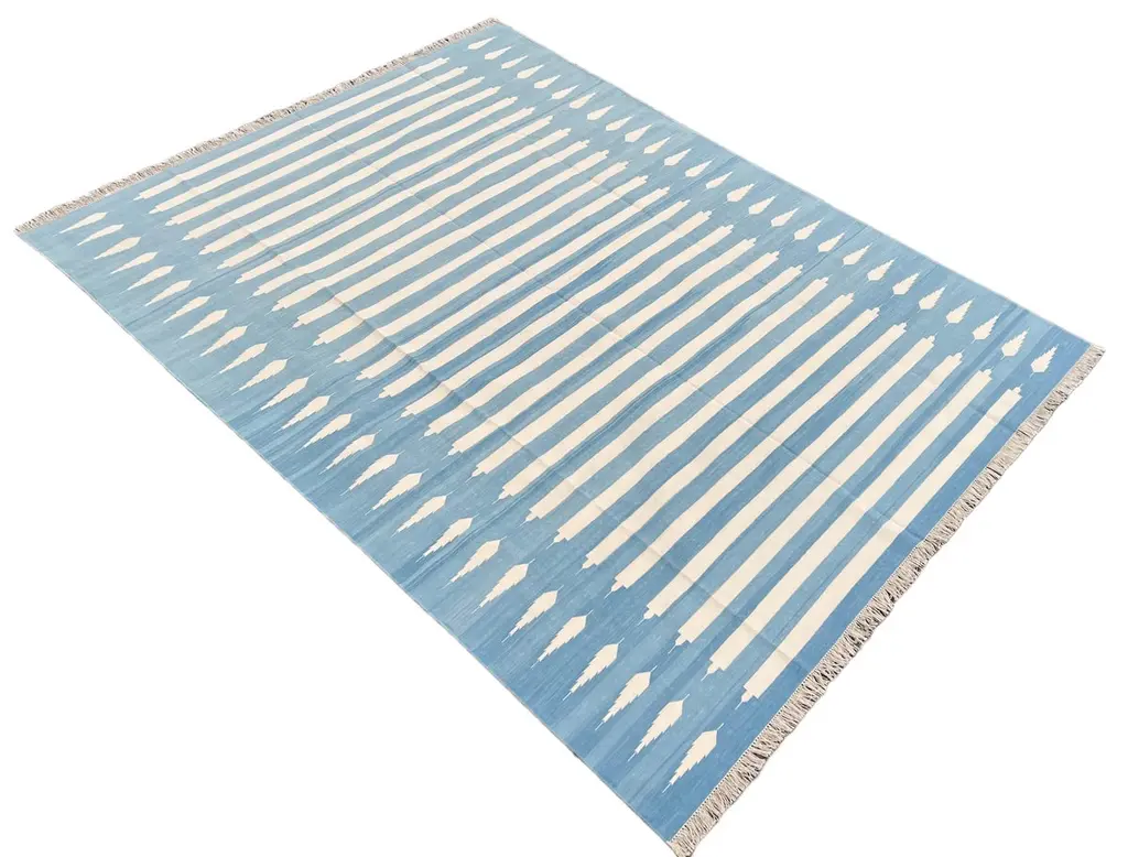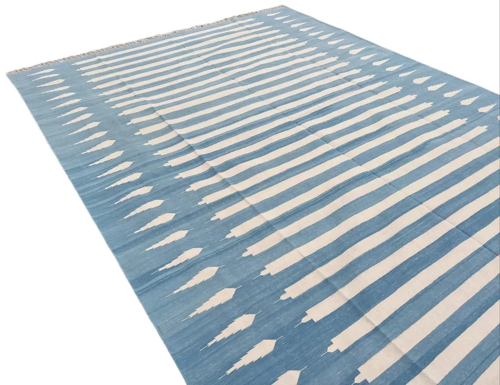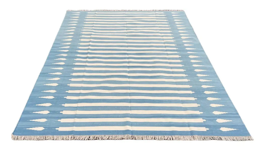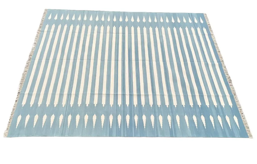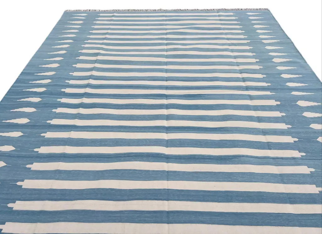 Cotton Natural Vegetable Dyed Sky Blue And White Striped Indian Rug-8'x10'These special flat-weave dhurries are hand-woven with 15 ply 100% cotton yarn. Due to the special manufacturing techniques used to create our rugs, the size and color of each piece may vary a little. The striking colour is achieved using natural vegetable dyes. We recommend that rugs are always used with an anti-slip underlay. Rugs should be regularly brushed or hovered with a suction-only appliance to prevent the build-up of damaging dust and grit. To avoid fading over time, rotate and flip your rug regularly.We recommend that rugs are always used with an anti-slip underlay. Rugs should be regularly brushed or hovered with a suction-only appliance to prevent the build-up of damaging dust and grit. To avoid fading over time, rotate and flip your rug regularly.Please note - due to the handmade nature of this rug, size variations of 2-3 inches are to be expected (both length and/or width). The rugs are washed by hand in an iron frame so often the size is increased after washing. As a result, the finished rug size may be slightly longer or wider than the dimensions listed.