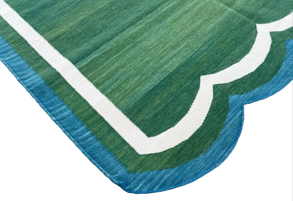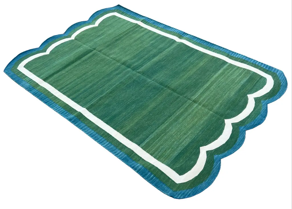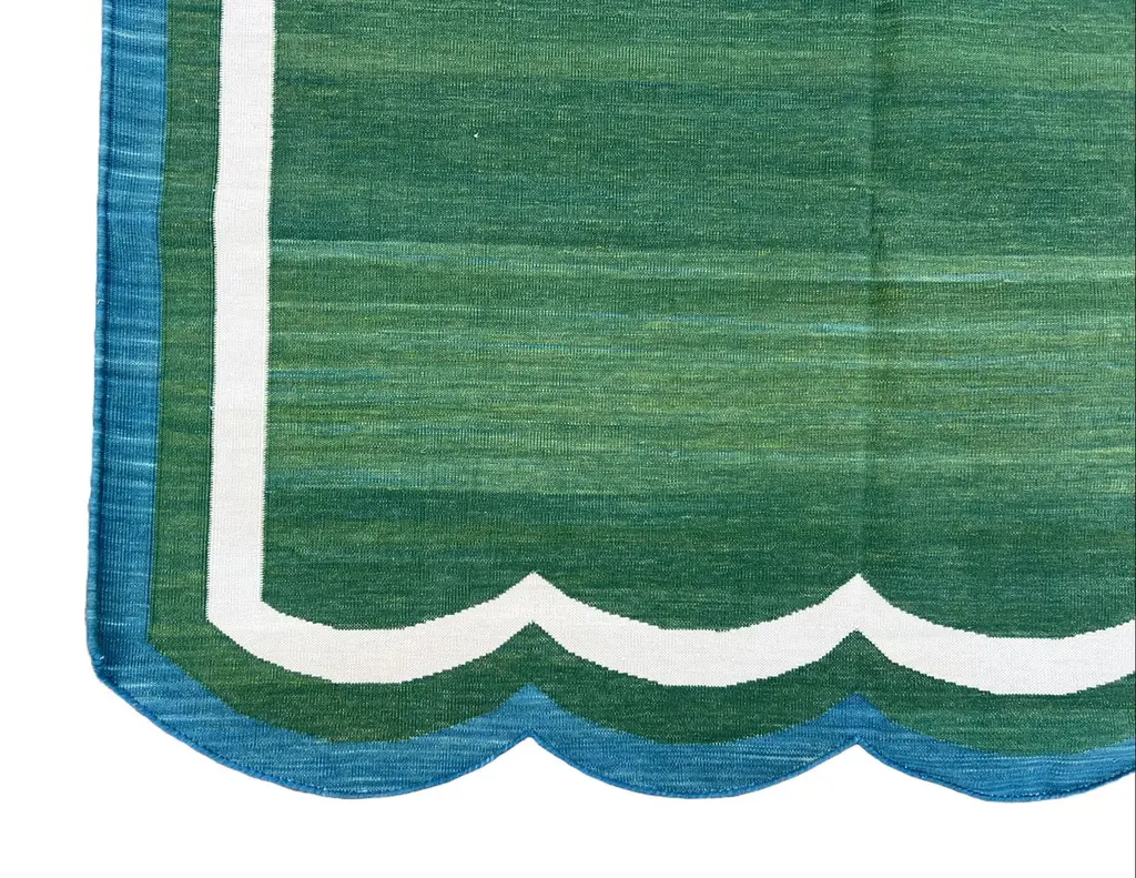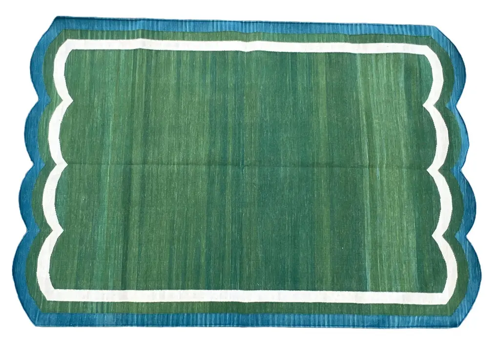 Cotton Vegetable Dyed Forest Green & Teal Blue Two Sided Scalloped Rug-4'x6' (Scallops runs on all 4 Sides)These special flat-weave dhurries are hand-woven with 15 ply 100% cotton yarn. Due to the special manufacturing techniques used to create our rugs, the size and color of each piece may vary a little. The striking colour is achieved using natural vegetable dyes. We recommend that rugs are always used with an anti-slip underlay. Rugs should be regularly brushed or hovered with a suction-only appliance to prevent the build-up of damaging dust and grit. To avoid fading over time, rotate and flip your rug regularly.We recommend that rugs are always used with an anti-slip underlay. Rugs should be regularly brushed or hovered with a suction-only appliance to prevent the build-up of damaging dust and grit. To avoid fading over time, rotate and flip your rug regularly.Please note - due to the handmade nature of this rug, size variations of 2-3 inches are to be expected (both length and/or width). The rugs are washed by hand in an iron frame so often the size is increased after washing. As a result, the finished rug size may be slightly longer or wider than the dimensions listed.