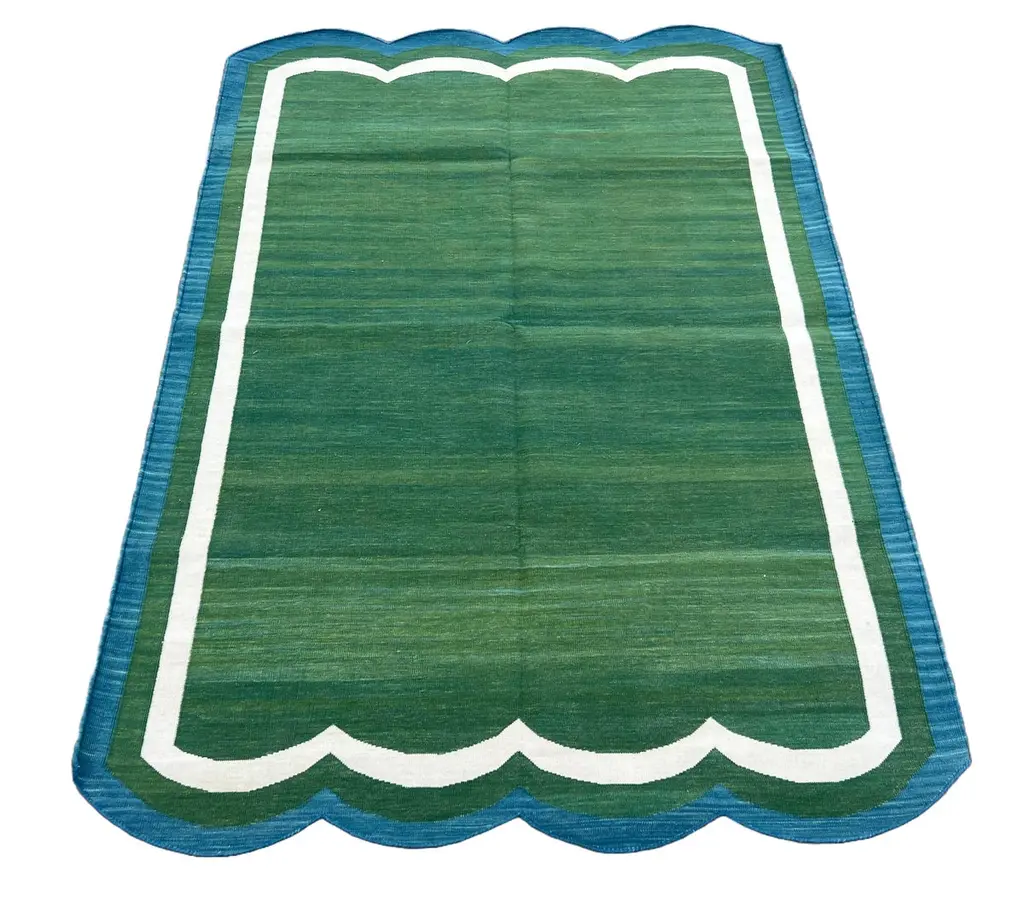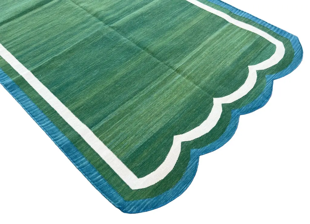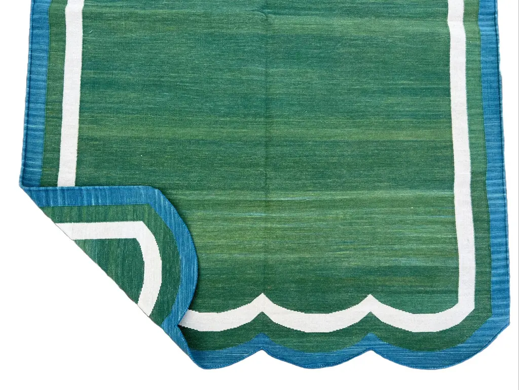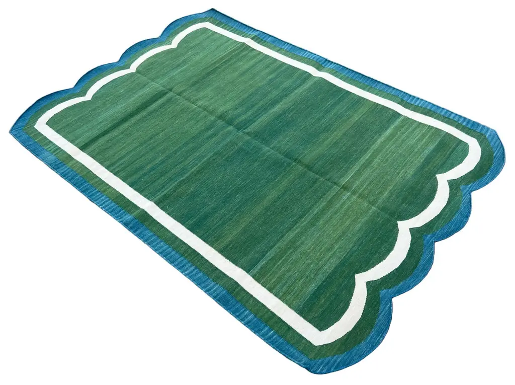 Cotton Vegetable Dyed Forest Green & Teal Blue Two Sided Scalloped Rug-4'x6' (Scallops runs on all 4 Sides)These special flat-weave dhurries are hand-woven with 15 ply 100% cotton yarn. Due to the special manufacturing techniques used to create our rugs, the size and color of each piece may vary a little. The striking colour is achieved using natural vegetable dyes. We recommend that rugs are always used with an anti-slip underlay. Rugs should be regularly brushed or hovered with a suction-only appliance to prevent the build-up of damaging dust and grit. To avoid fading over time, rotate and flip your rug regularly.We recommend that rugs are always used with an anti-slip underlay. Rugs should be regularly brushed or hovered with a suction-only appliance to prevent the build-up of damaging dust and grit. To avoid fading over time, rotate and flip your rug regularly.Please note - due to the handmade nature of this rug, size variations of 2-3 inches are to be expected (both length and/or width). The rugs are washed by hand in an iron frame so often the size is increased after washing. As a result, the finished rug size may be slightly longer or wider than the dimensions listed.