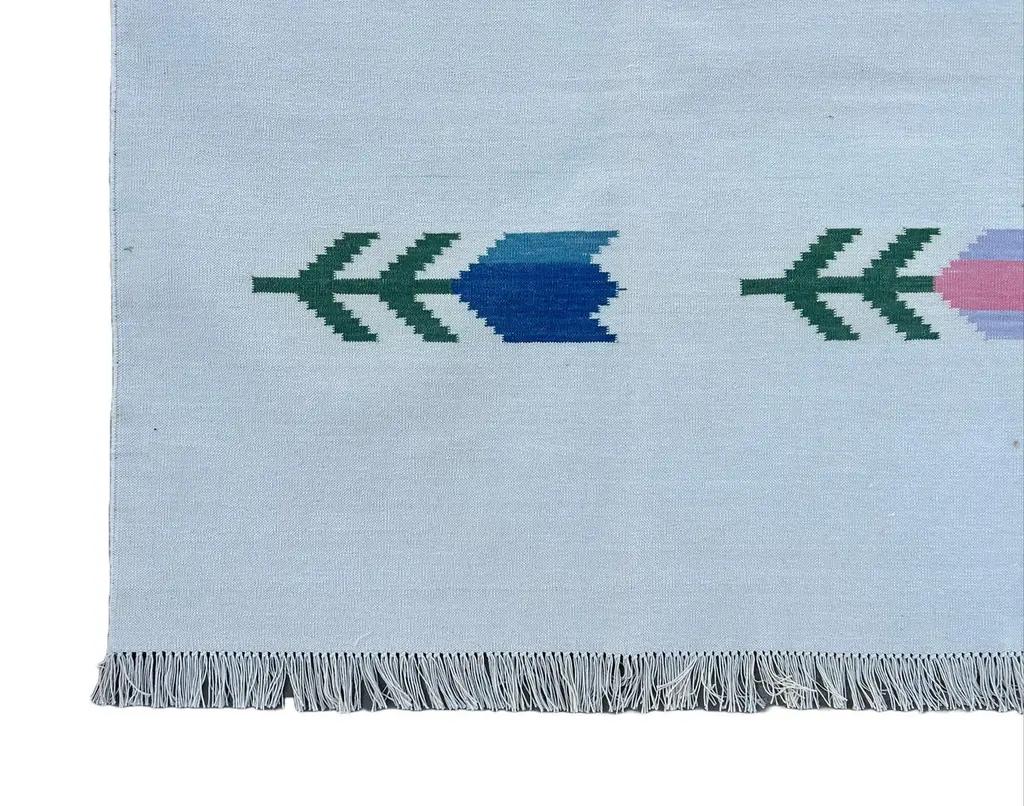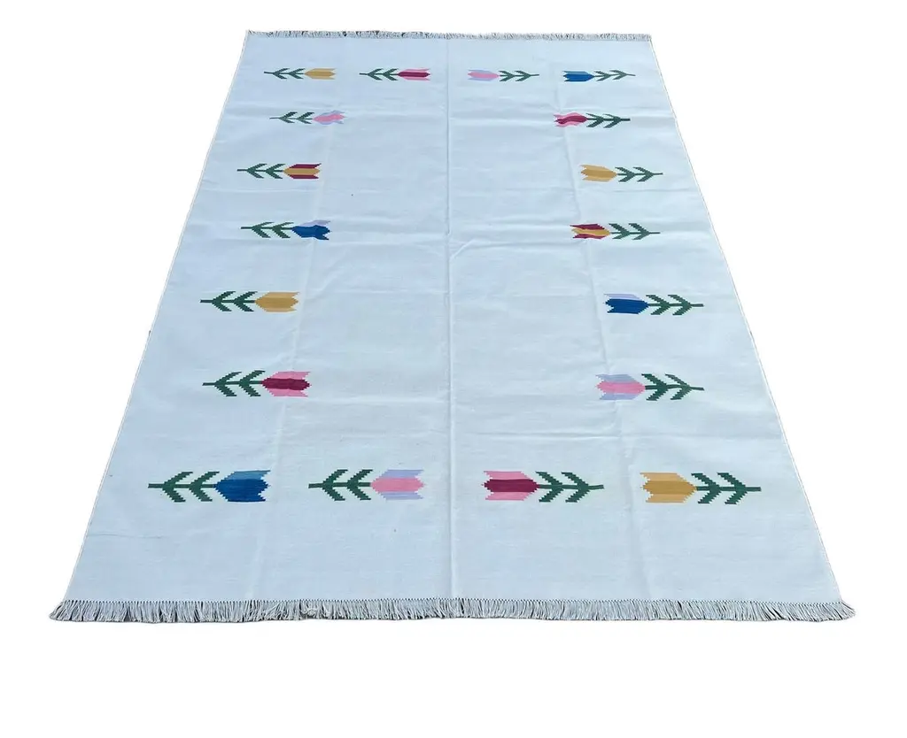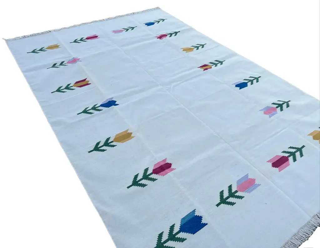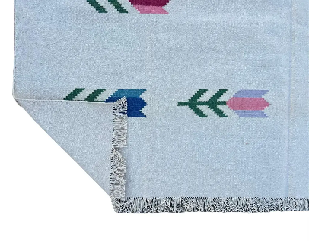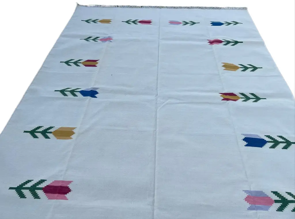 Handmade Cotton Area Flat Weave Rug, White & Green Leaf Patterned Indian Dhurrie