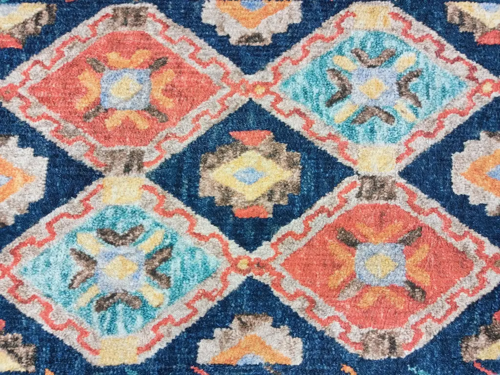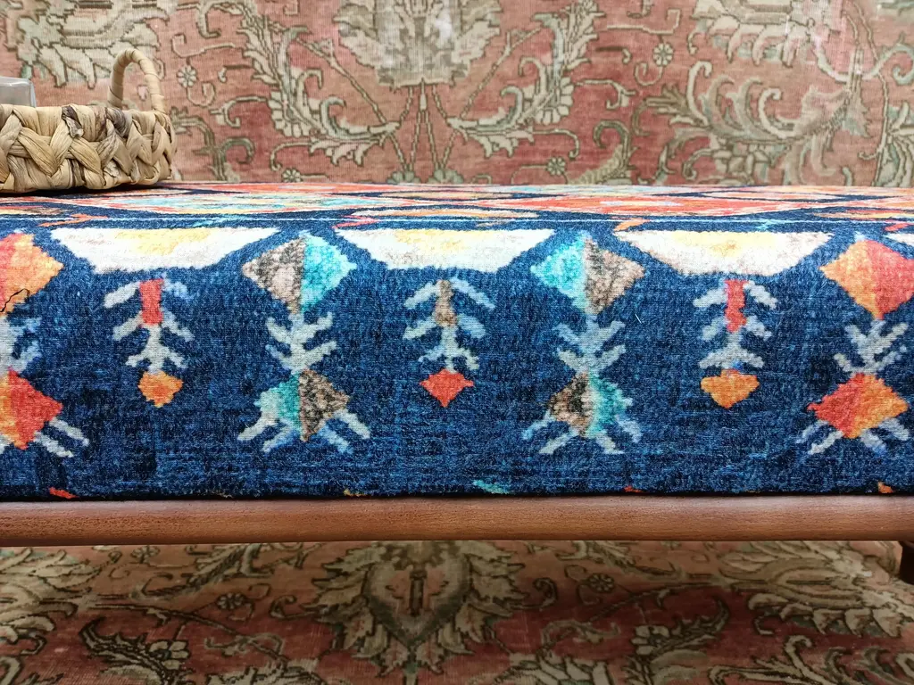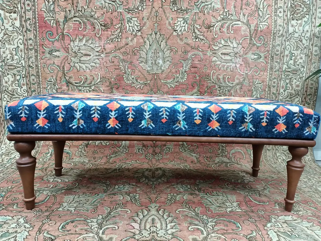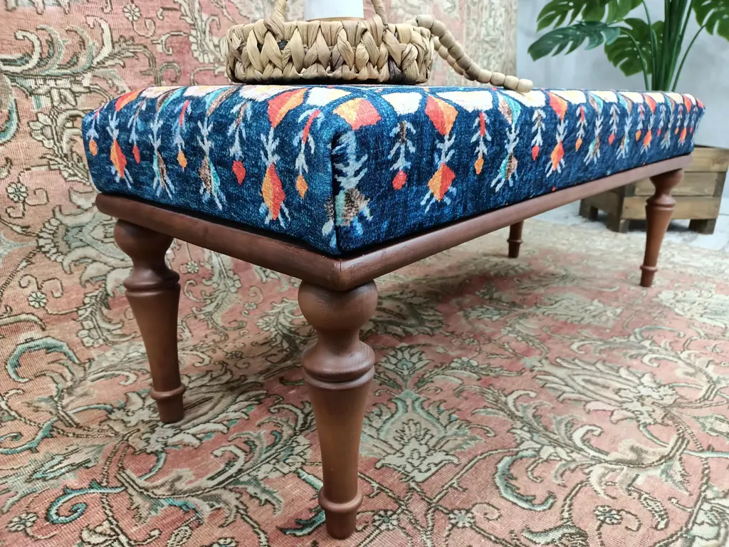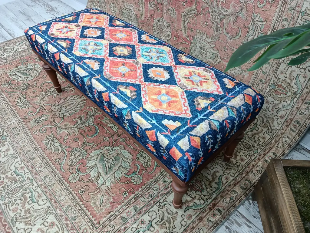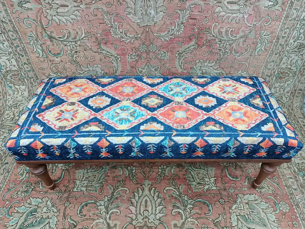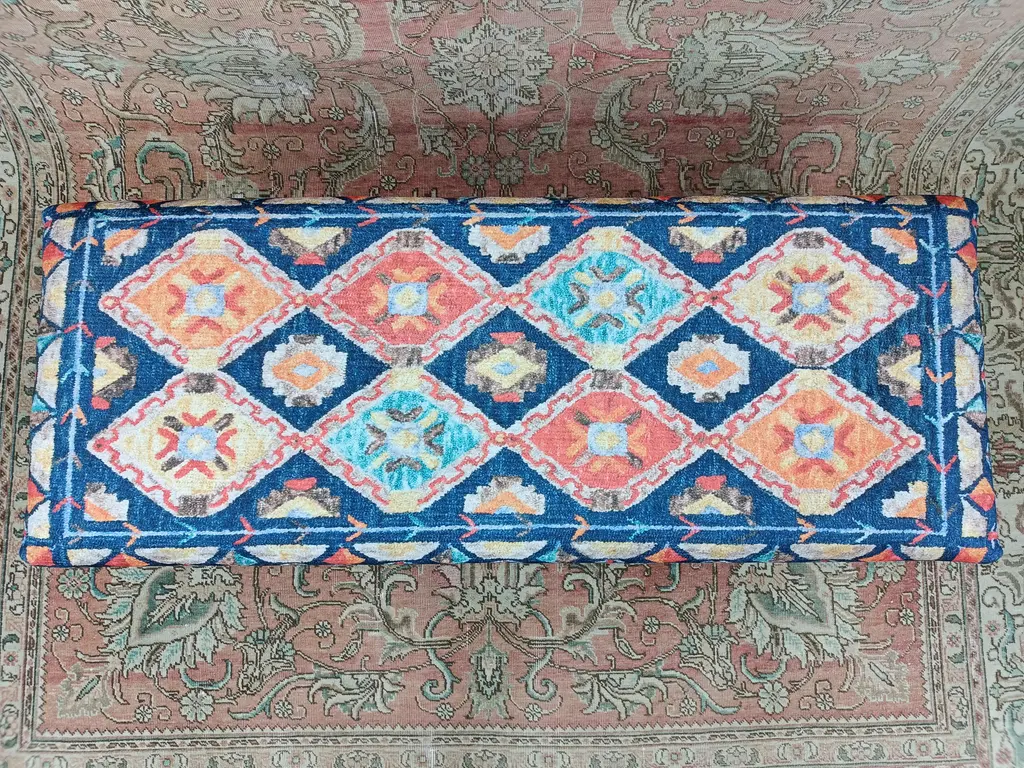 Handmade Diamond Pattern Blue Printed Rug Fabric Upholstered Long Bench