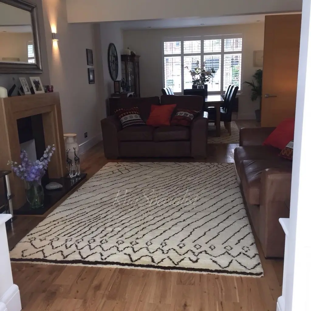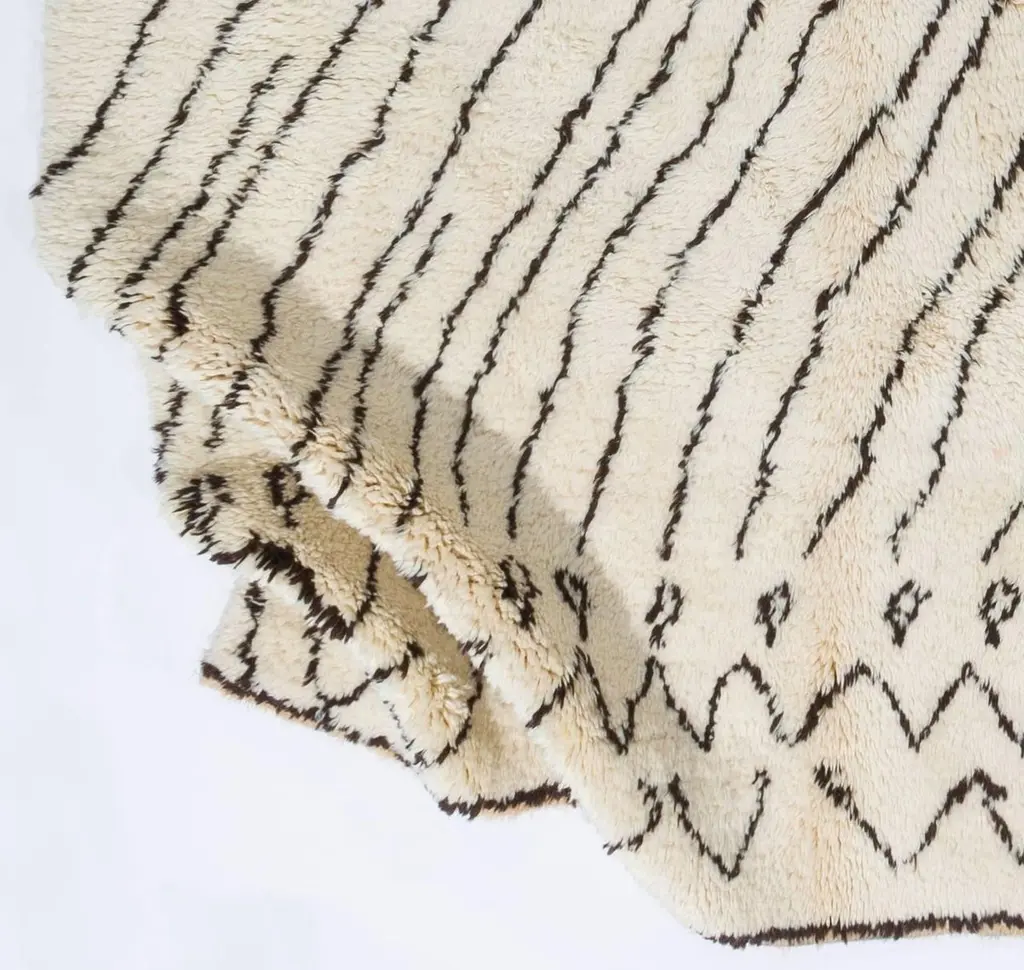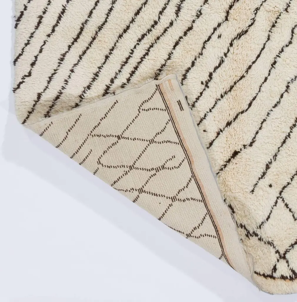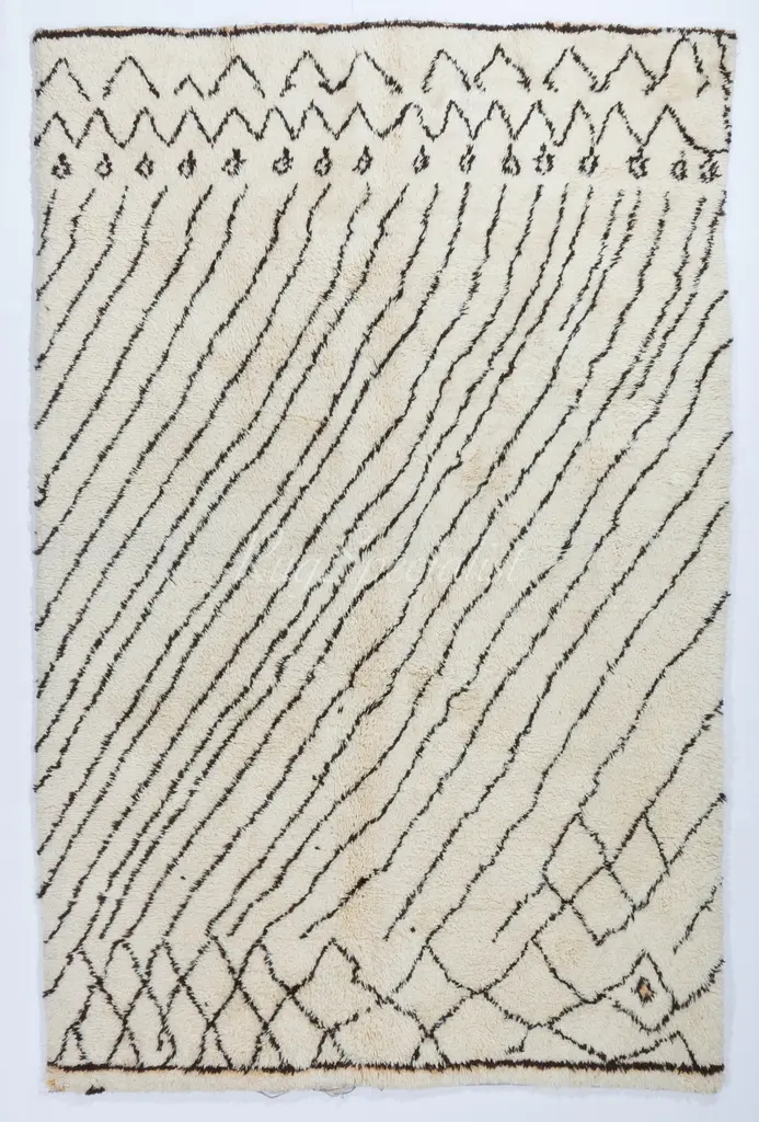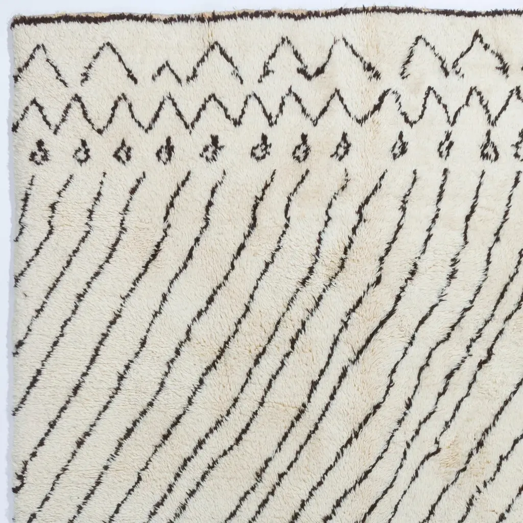 This hand-knotted contemporary wool rug draws inspiration from Moroccan Berber traditions, featuring a series of free-flowing diagonal brown lines across an ivory field, framed with abstract geometric motifs along the borders. The irregular rhythm of the design lends it a natural, organic aesthetic while maintaining a modern minimalist appeal.Crafted from 100% hand-spun wool, the rug has a plush medium pile that feels soft, cozy, and inviting underfoot. Produced in our Central Anatolia atelier—renowned as one of the world’s oldest rug-making centers—it is woven by highly skilled women artisans who continue a centuries-old craft with contemporary refinement. Sturdy and durable, this rug is well-suited for both residential and commercial interiors, comfortably withstanding high-traffic areas while retaining its softness.Custom Options:This rug can be reproduced in any custom size, color palette, or pile thickness within approximately 4–6 weeks depending on the size.Styling Notes:The bold yet understated pattern makes it versatile—ideal as a statement piece in a neutral modern living room, layered in eclectic bohemian interiors, or paired with clean-lined contemporary furniture for a touch of warmth and texture.Details:• Material: 100% hand-spun wool• Technique: Hand-knotted• Origin: Central Anatolia, Turkey• Condition: New, one-of-a-kind