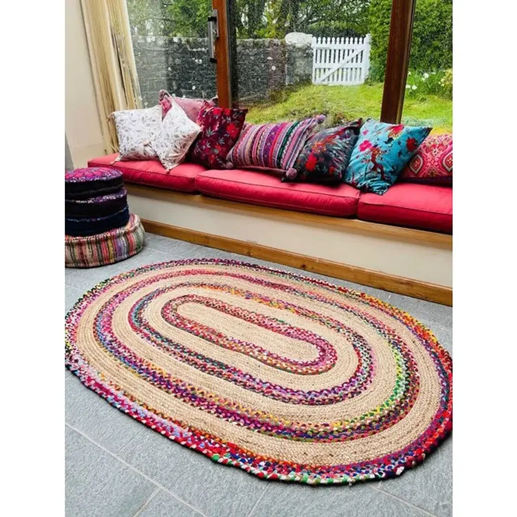 Material: Multi Color Cotton with Natural Jute.Slight color variation & weave irregularities may occur making each rug unique.Hand woven in a way such that rugs is long lasting and stands up.Reversible for double the usage of rug.Regularly Vacuuming, Rotation and occasional gentle shake will keep this rug good looking.