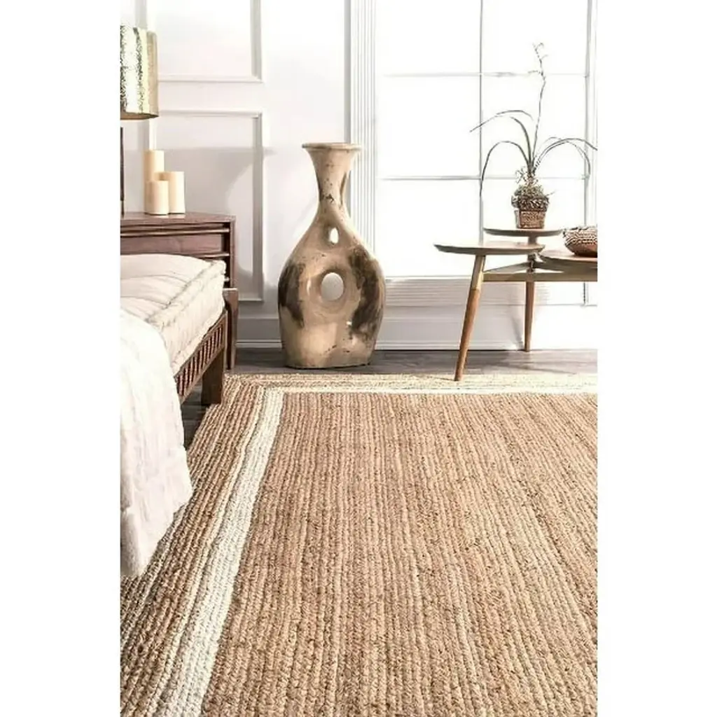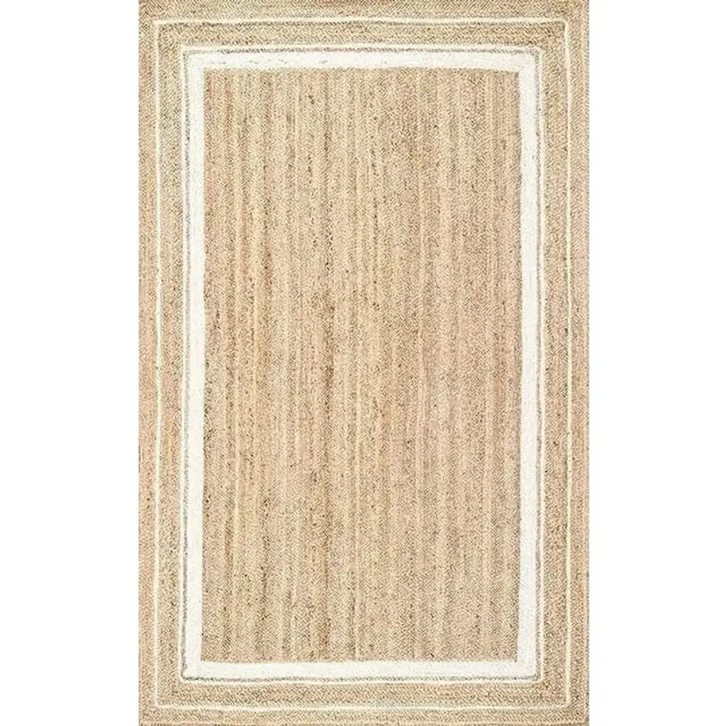 Handmade Pure Jute Area Rug With White Boundary Accents, Farmhouse Style, 5' X 7'