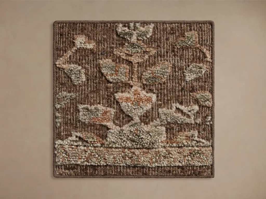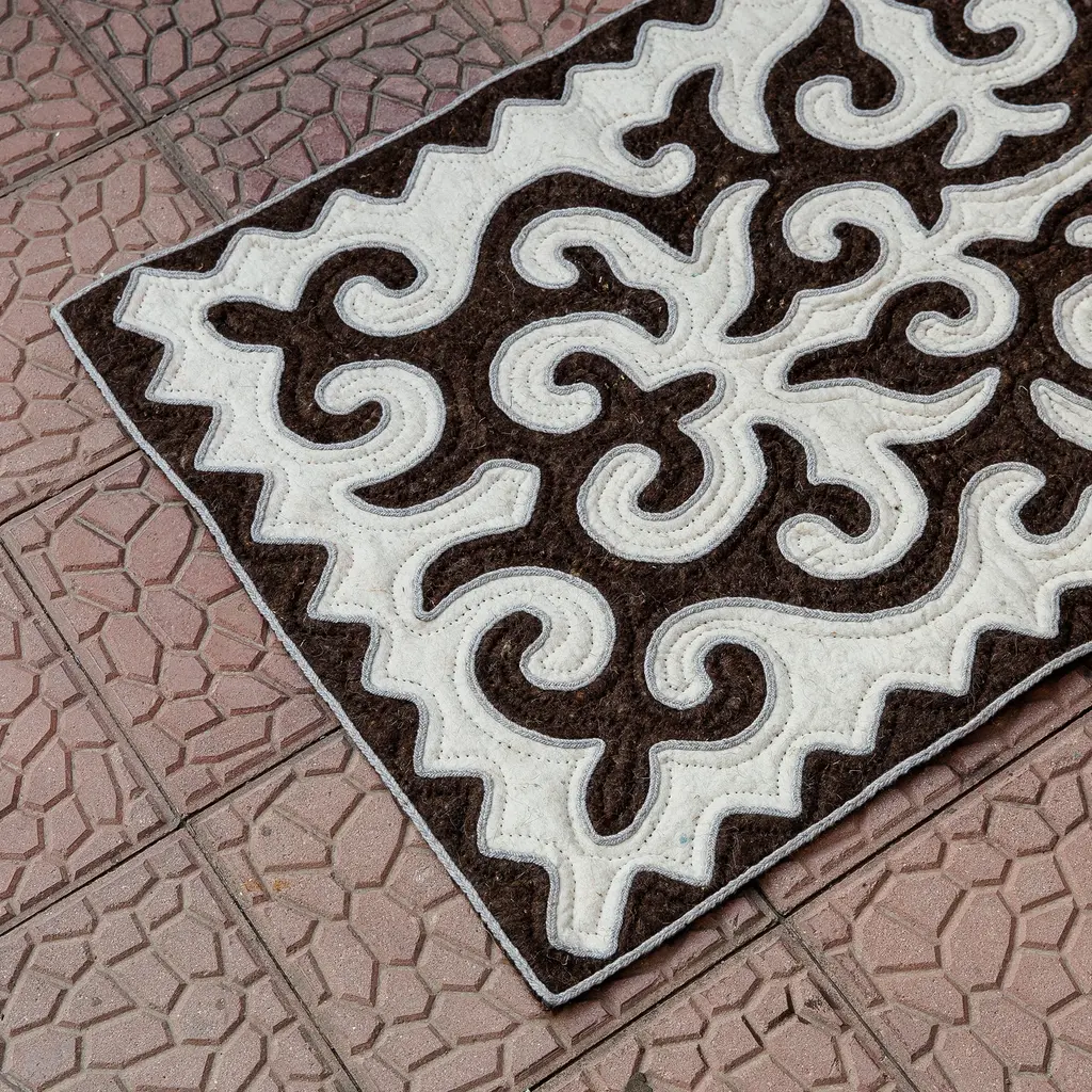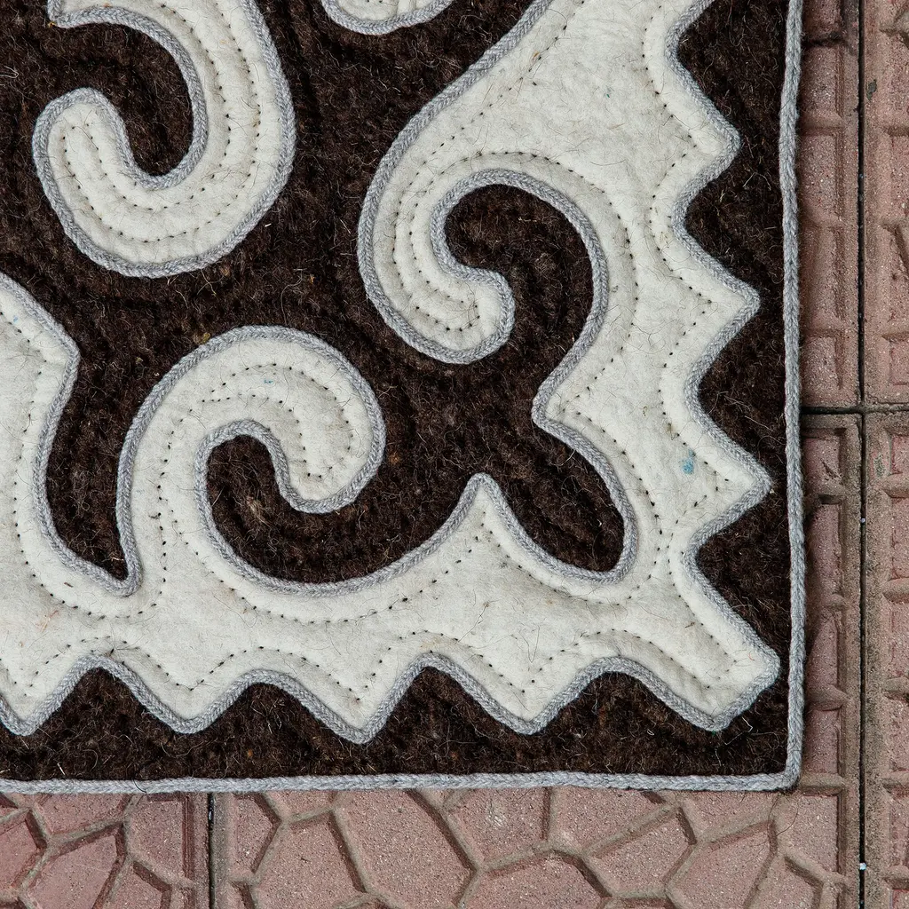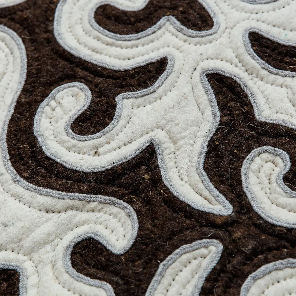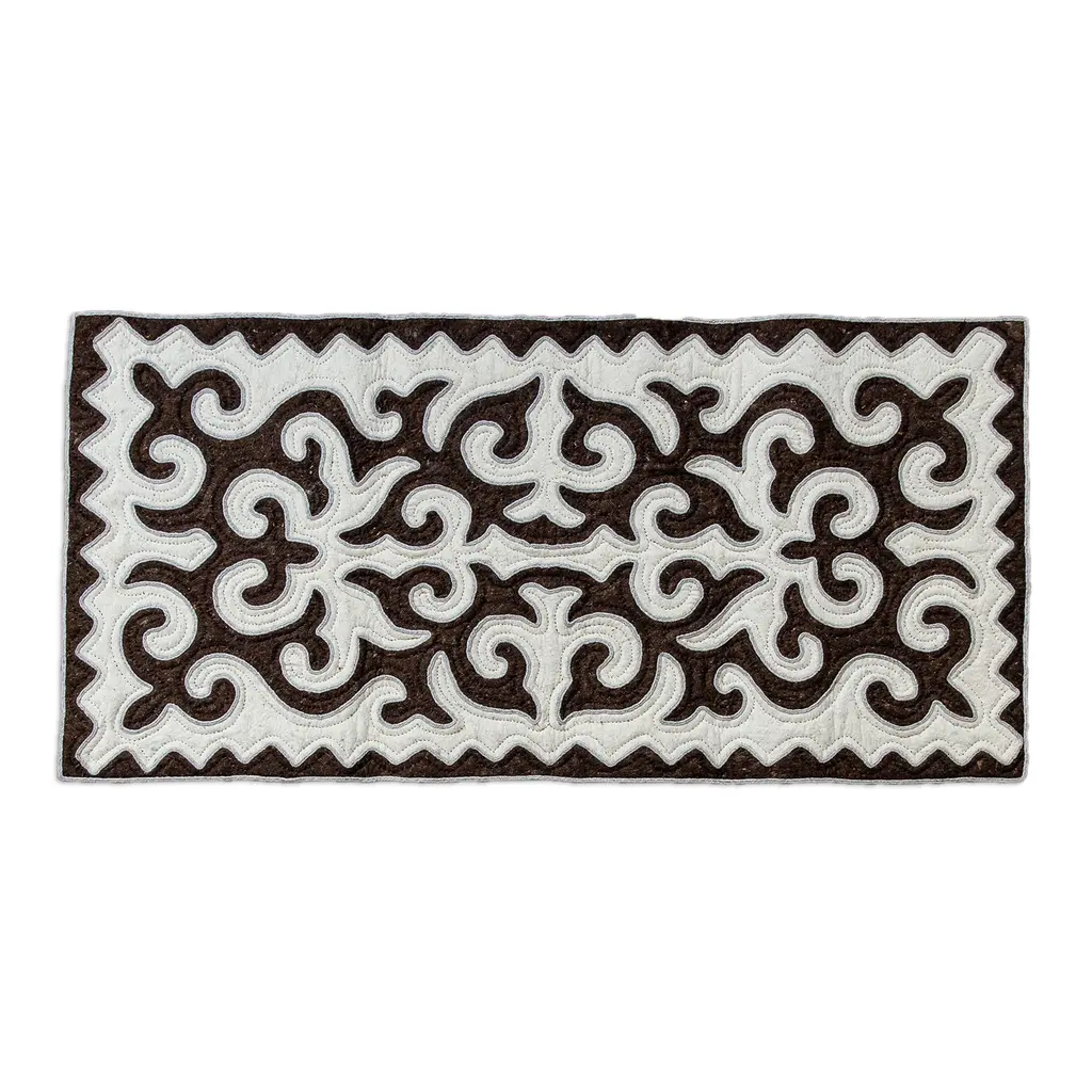 The beauty and elegance of the marvelous Kyrgyz region are captured in a majestic wool area rug made in the shyrdak style. Crafted by Burul Zhakypova, this sublime home accent features a classic pattern made from quilting and applique techniques, enriching the brown and white palette that decorates the piece for a lustrous vibe.