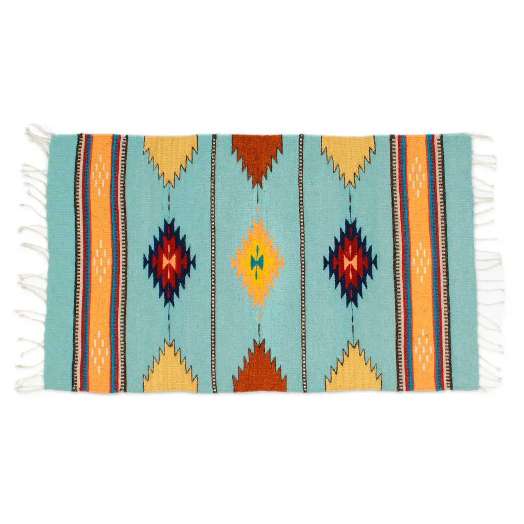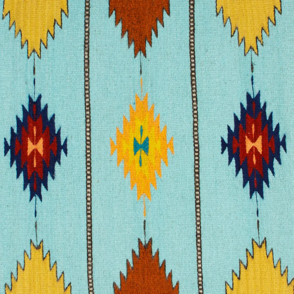 Mexico's Ruiz Bazan Family shows the luxury of the Zapotec textile artistry with a sublime handwoven piece in a palette of aquamarine and marigold hues. The artisans work on traditional looms to create this fringed wool area rug, whose geometric pattern of diamond motifs and stripes exudes a graceful aura perfect for any home decor.