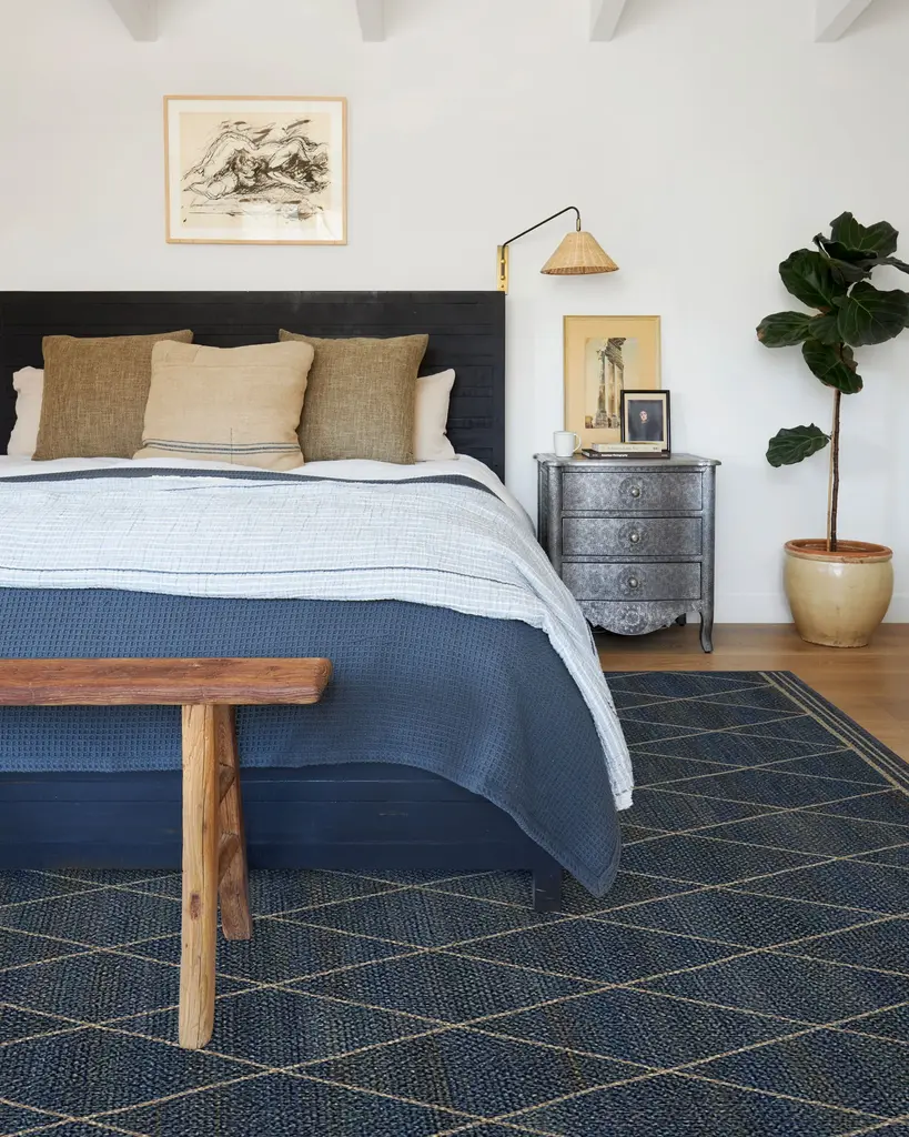 The new neutral. Vivid tones of blue, slate, teal, and navy create a subtle striation overlaid with a tan diamond trellis pattern. This rug's washable woven texture in natural tan mimics jute. Made with recycled + virgin polyester, and polyurethane.
