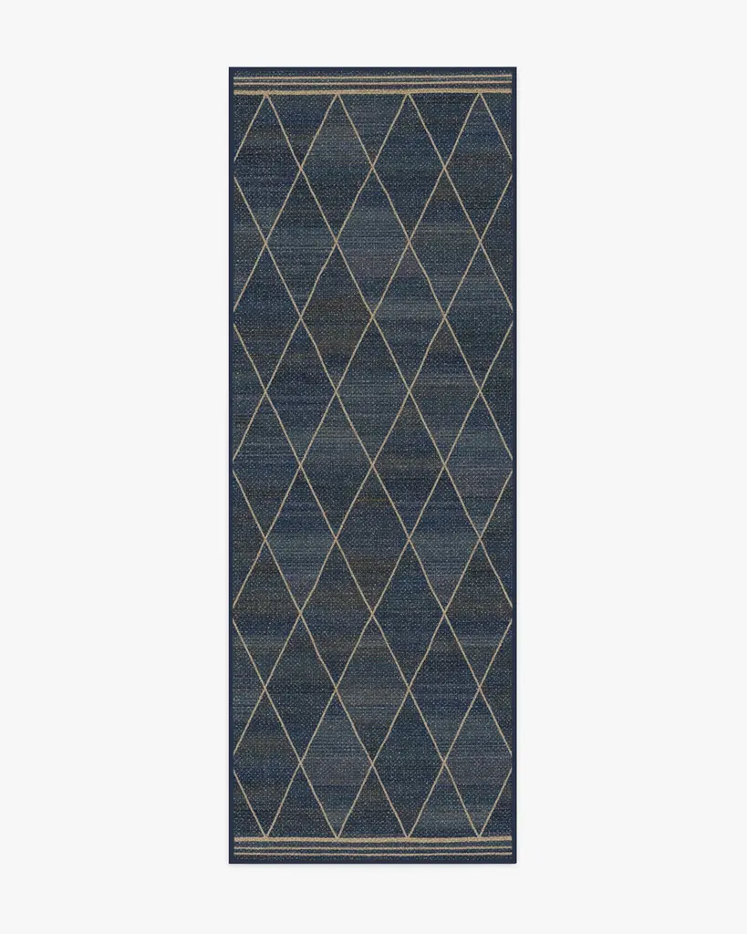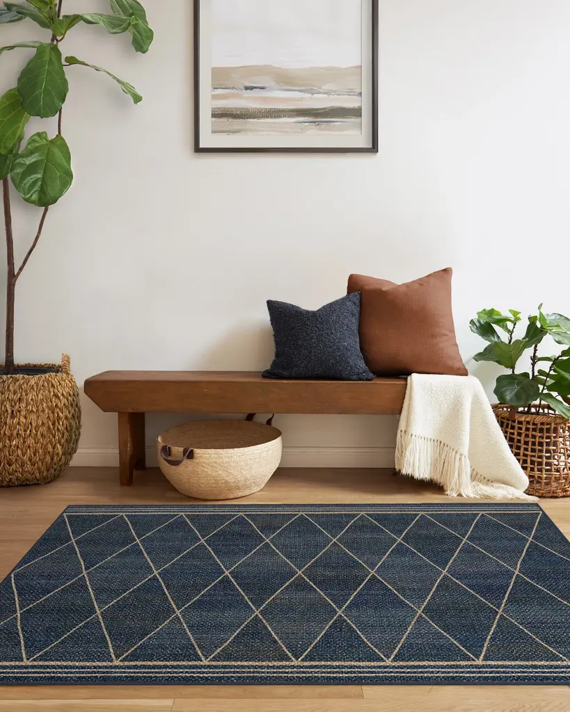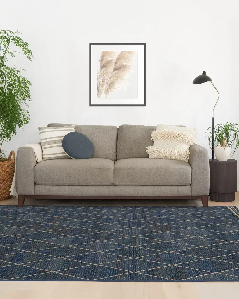The new neutral. Vivid tones of blue, slate, teal, and navy create a subtle striation overlaid with a tan diamond trellis pattern. This rug's washable woven texture in natural tan mimics jute. Made with recycled + virgin polyester, and polyurethane.