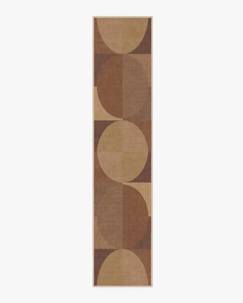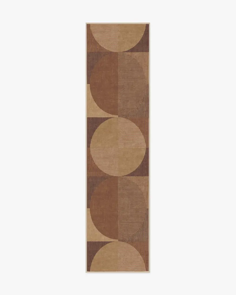 Add contemporary flair to any space with our Harlow Copper & Brown Rug. Featuring bold, geometric shapes, dynamic stripes, and a captivating color palette, this retro design creates a visually striking composition. Warm browns, terracotta copper, golds, and yellow ochre are beautifully set against a rich, natural cream background. Water-resistant, stain-resistant, and machine-washable. Rug colors may vary slightly according to your device and the lighting in your space.