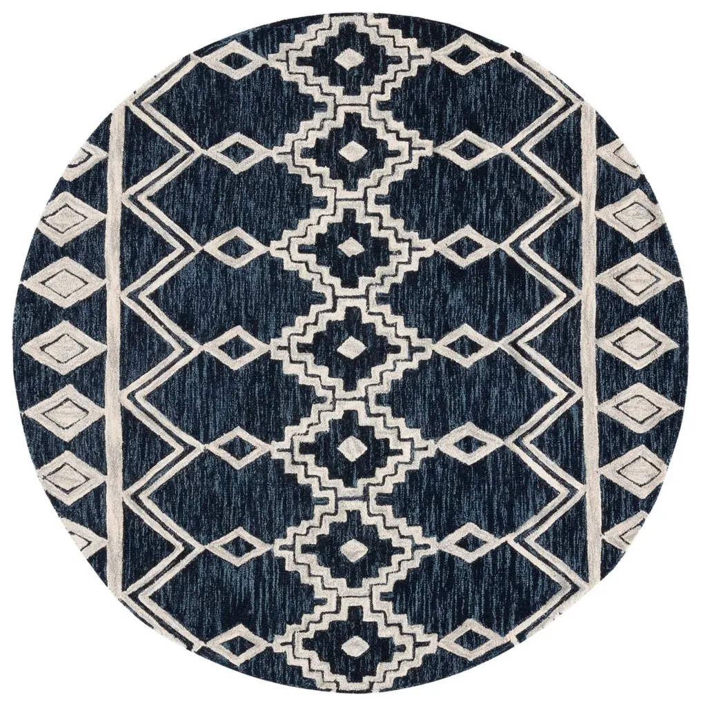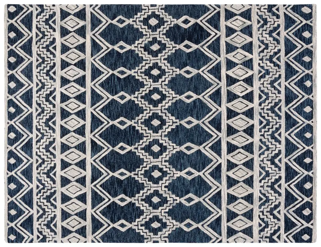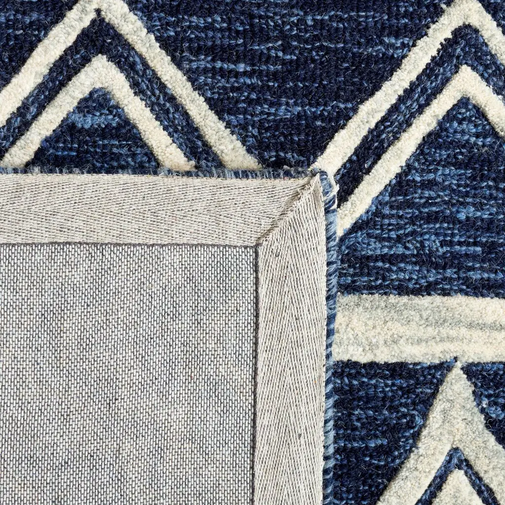 Indulge in the luxury of handcrafted elegance with our exquisite 3' X 5' small rectangle area rug, boasting a contemporary pattern that exudes sophistication. The harmonious navy and ivory palette seamlessly blends with the diamond and geometric motifs, creating a visual feast for the eyes. Hand tufted in India, the skilled artisans have woven this magnificent piece from the finest wool, ensuring a plush feel underfoot and durability for years of enjoyment. Its moderate pile height provides a comfortable layer between you and the floor, making it not just a statement piece, but a practical addition to your living space. Update your home with this woolen masterpiece that captures the essence of modern design while honoring the traditional craftsmanship of Indian rug making.