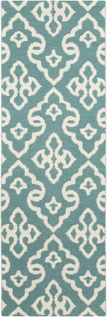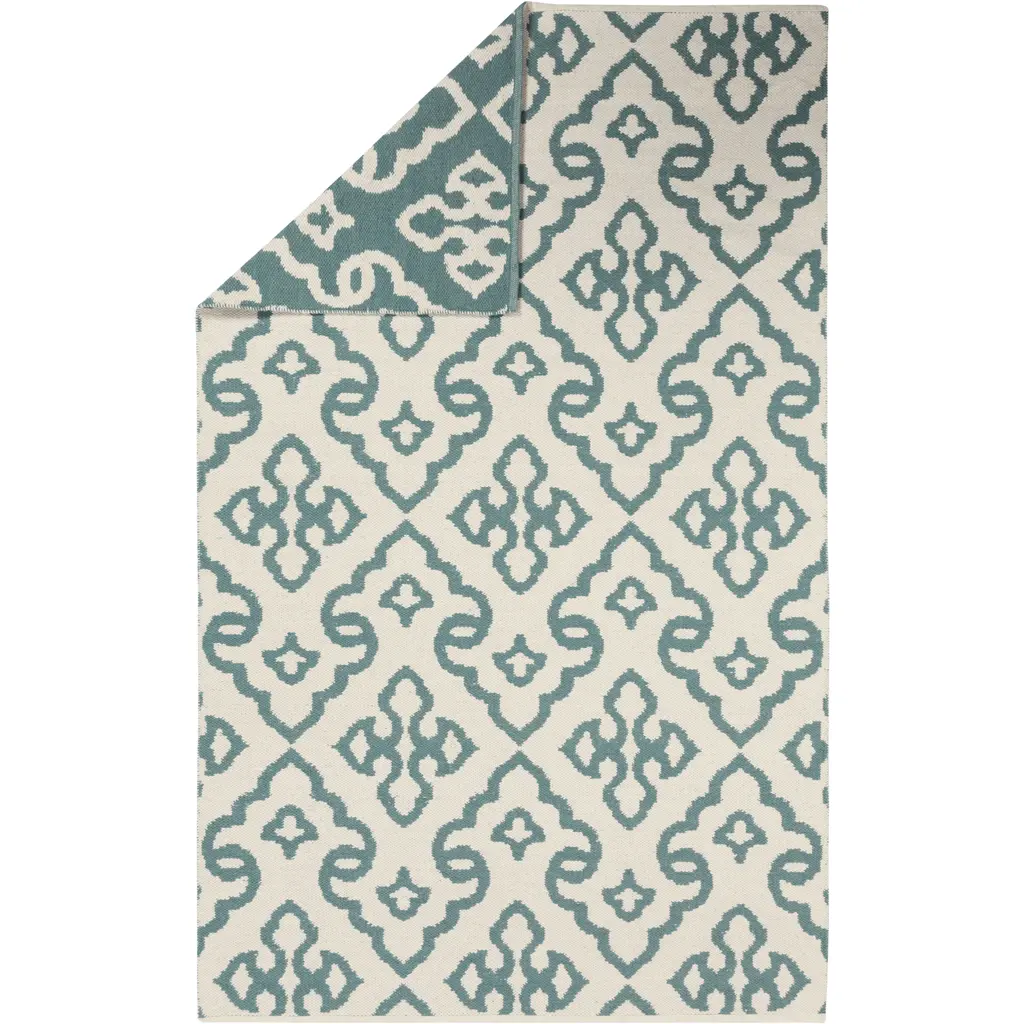 Collection: Harts Colors: Ivory, Teal Construction: Hand Woven Material: 100% Wool Pile: No Pile Styles: Transitional,Bohemian Made In: India Thickness: 0.31" Price Range: $$$$$ (Affordable)