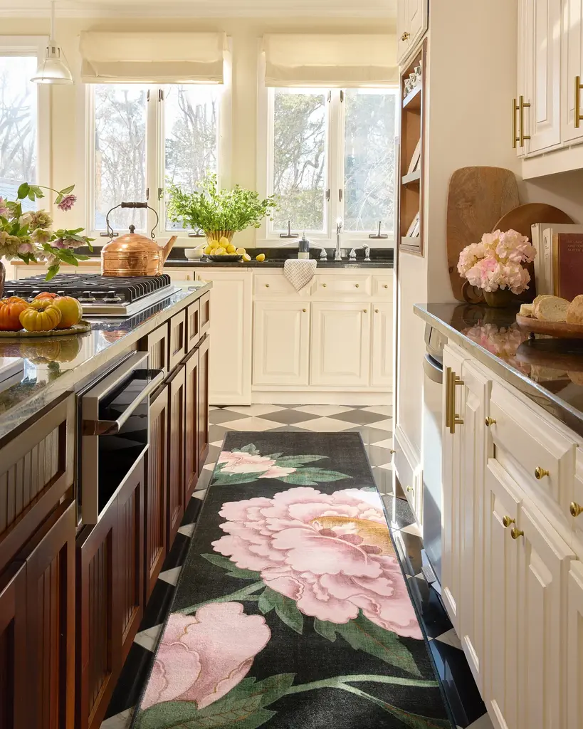 Our Gracie Haru Charcoal Rug features budding flowers paired with an asymmetrical negative space to add a modern, dynamic feel. A palette of soft blush pinks, greens, and gold embellishments against a charcoal background gives it an antiqued aesthetic. Water-resistant, stain-resistant, and machine-washable. Rug colors may vary slightly according to your device and the lighting in your space.